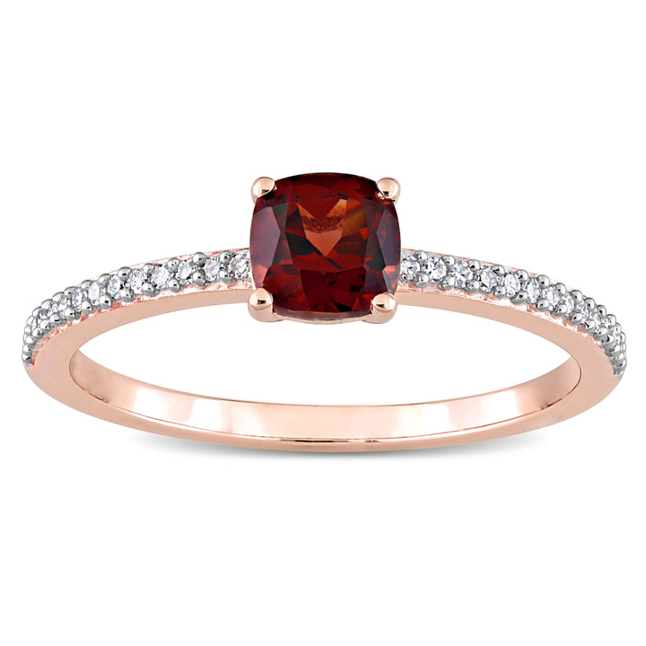 10k rose gold, 5/8 ct. cushion garnet, 1/10 ct. round-cut white diamonds. Ring width: 5 mm x 20.7 mm long. Band width: 1.5 mm.