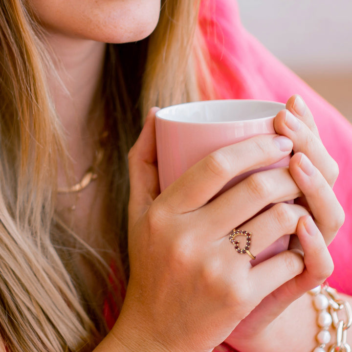 This 4/5ct TGW Garnet Heart Ring in 10K Yellow Gold by Mimi & Max is a beautiful and meaningful piece, perfect for a proposal or as a special gift. The open heart motif is outlined with 14 prong-set garnet gemstones, adding a pop of color and a romantic touch. Crafted in yellow gold, this high-polish ring symbolizes love and affection, making it a timeless addition to any collection.