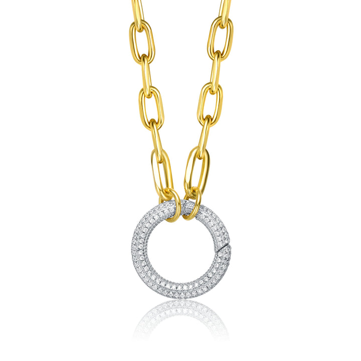 Crafted from sterling silver with 14k gold-plated chain. Features cubic zirconia and round diamonds set in the triangle pendant.