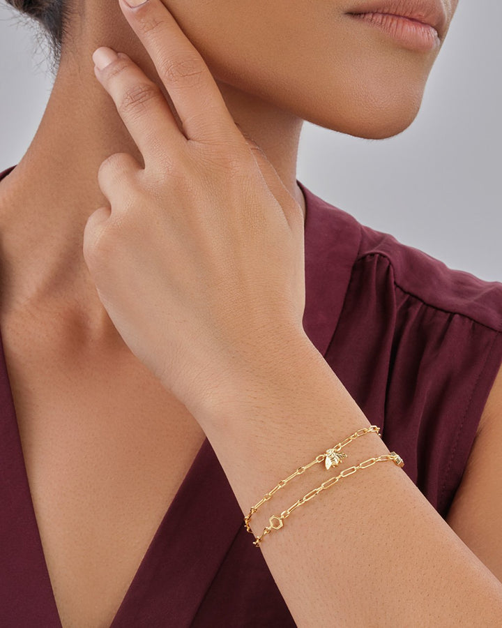 This Melina Charm Bracelet by Sterling Forever is a dainty and unique piece, featuring geometric layered links and a cute bee charm. It’s perfect for stacking with other bracelets or wearing solo to add a touch of elegance to your look. Available in gold and silver tones, this bracelet is ideal for any jewelry collection.