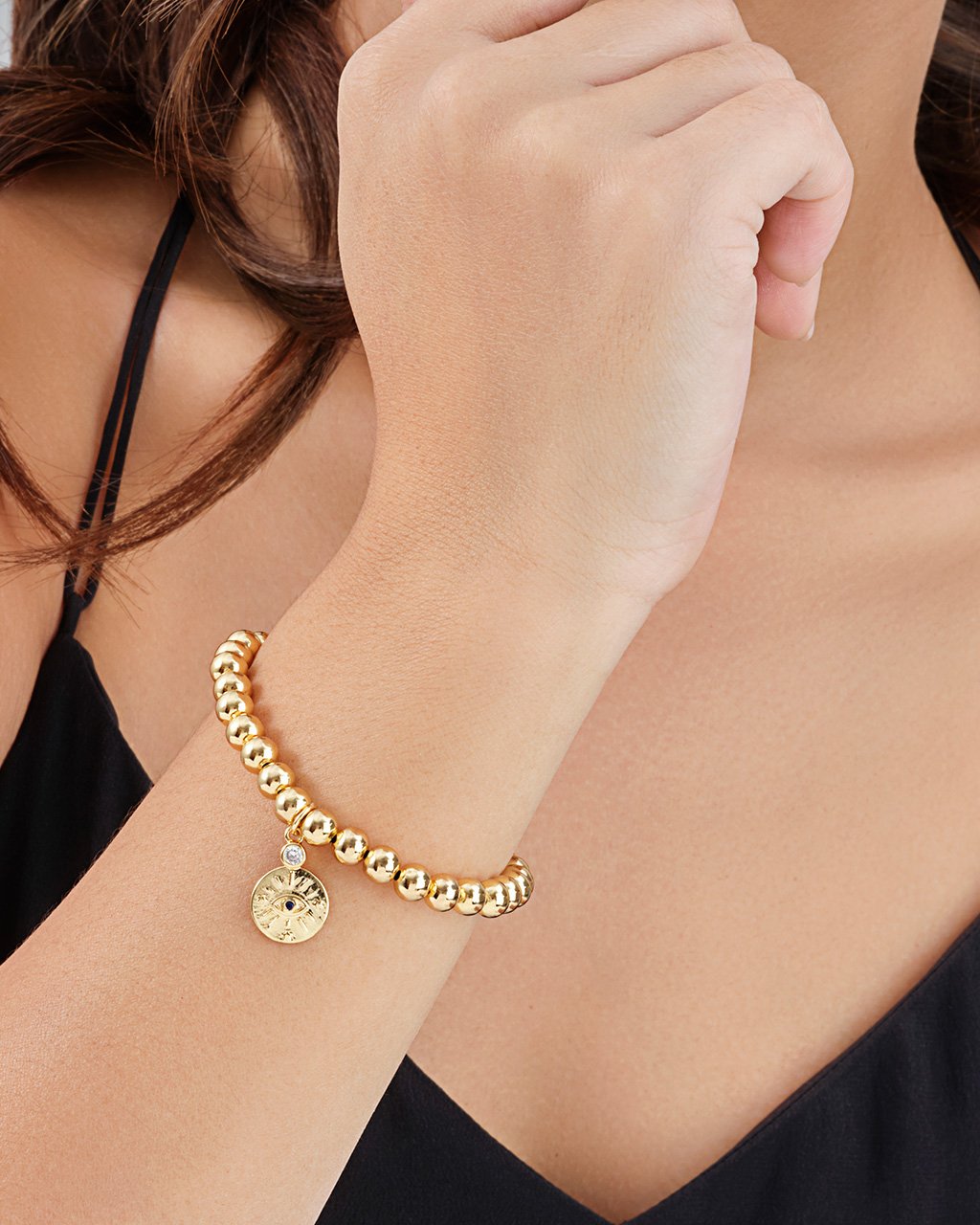 This Celestial Beaded Bracelet by Sterling Forever features a bold and captivating round disk charm with an eye-catching design. Available in gold and silver tones, this bracelet is made with 14K gold or rhodium-plated brass and cubic zirconia for a touch of sparkle. Its stretch design fits most wrist sizes, making it both stylish and versatile for everyday wear or special occasions.