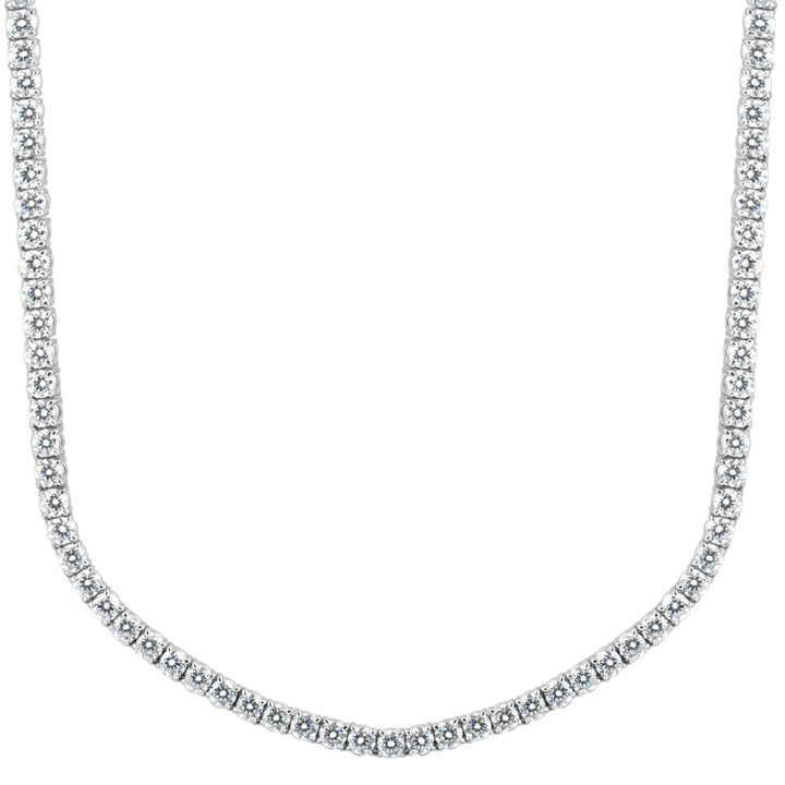 Crafted in solid 14K white gold. Features round brilliant-cut moissanite stones. Flexible, high-polish 18-inch mounting. Total moissanite weight: 23 ct.