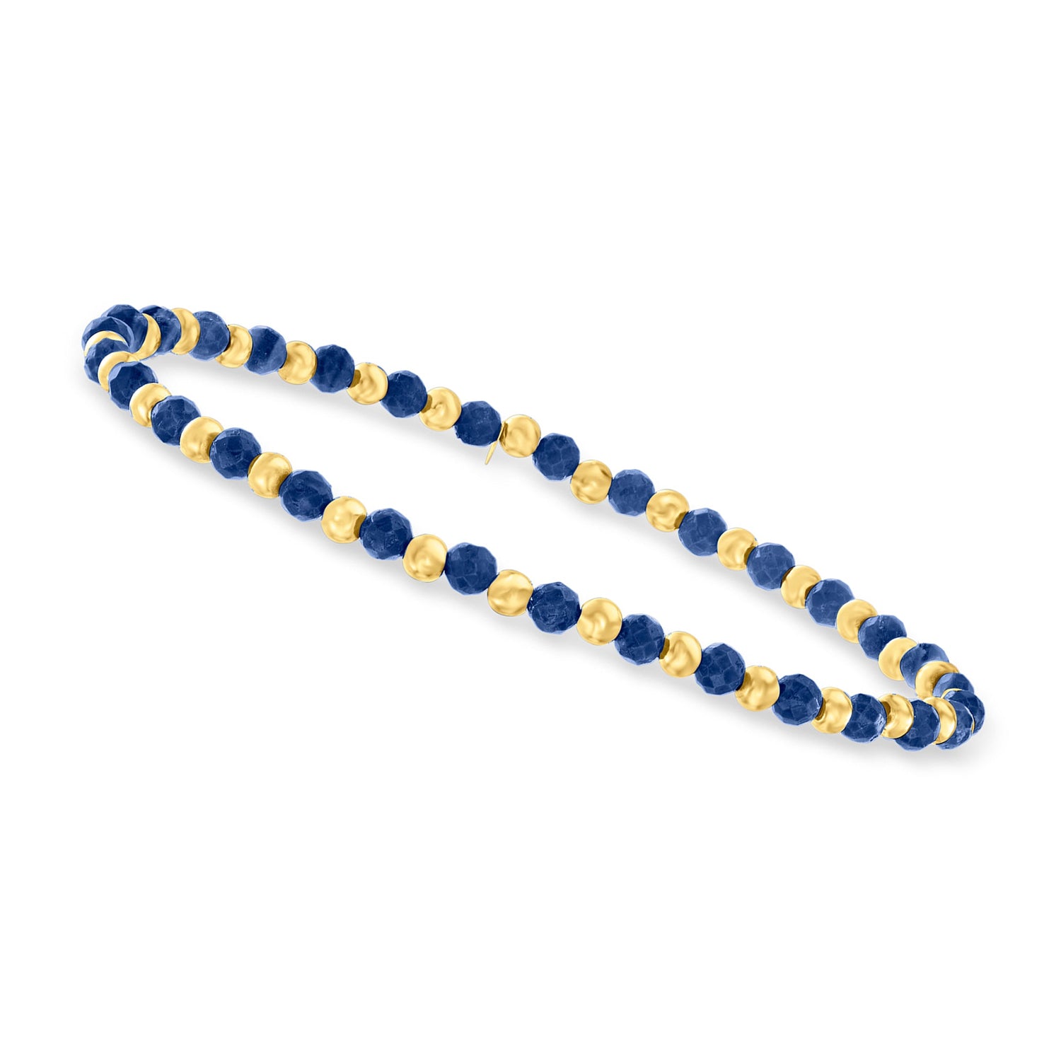 Crafted with 6.00-7.00 ct. t.w. of round faceted sapphires (3-4mm beads), accented with 3mm 10kt yellow gold spacer beads. The bracelet stretches to fit approximately a 7' wrist.