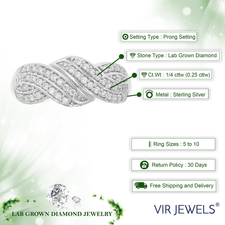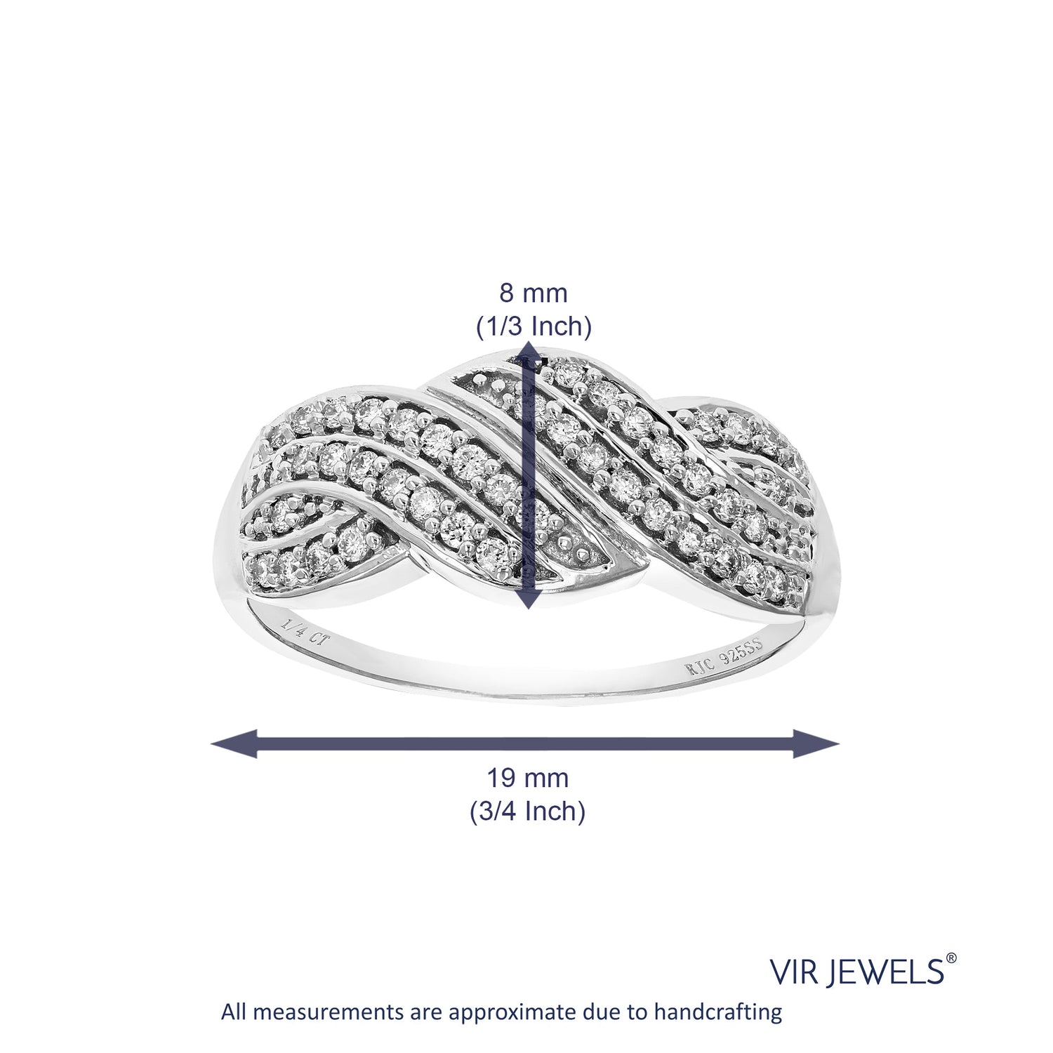 Handcrafted in .925 sterling silver with 41 round lab-grown diamonds (1/4 cttw). Diamond clarity: SI1-SI2, color: H-I. Prong setting. Ring width: 8 MM (1/3 Inch).