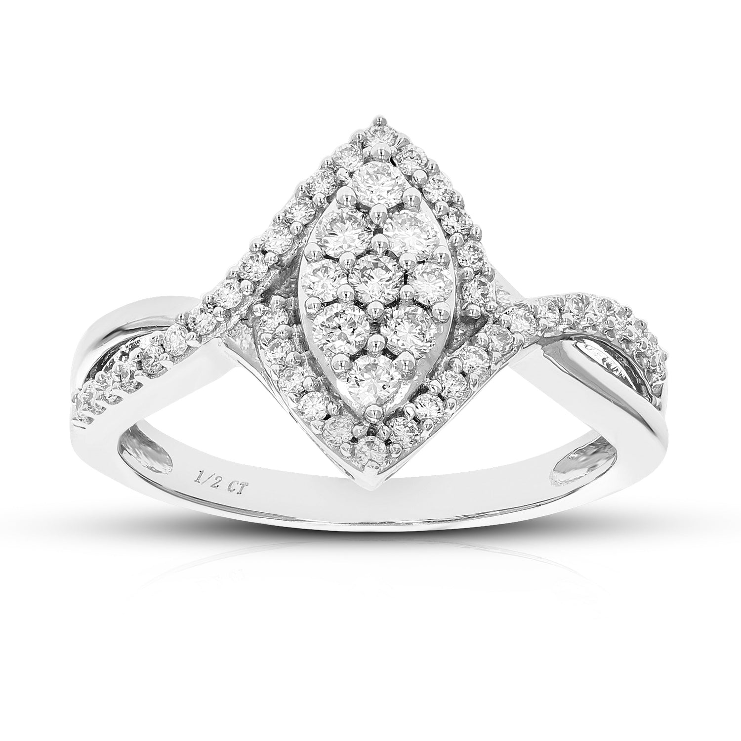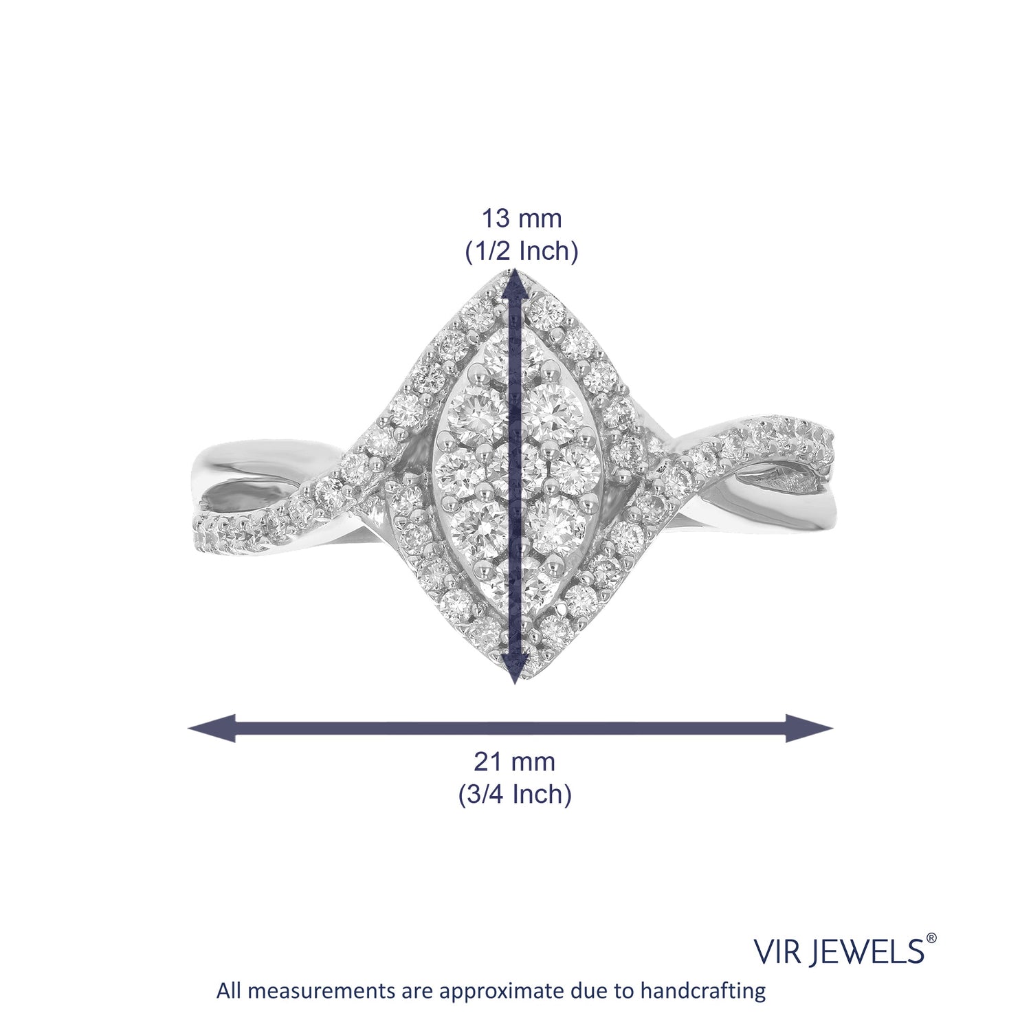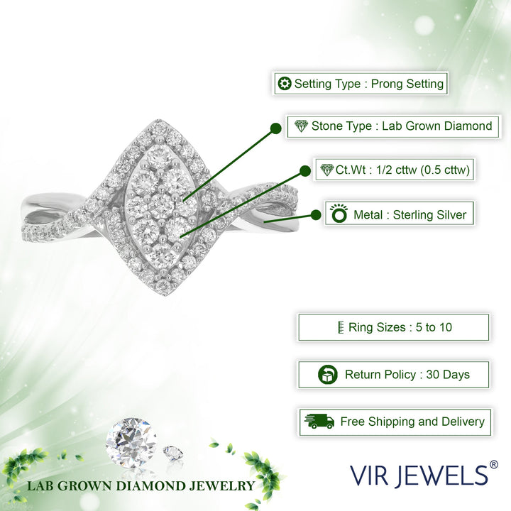 Crafted in .925 sterling silver with 47 round lab-grown diamonds totaling 1/2 cttw. Diamonds are H-I color, SI1-SI2 clarity. Prong setting for secure placement. Ring width: 13mm (1/2 inch), length: 21mm (3/4 inch).