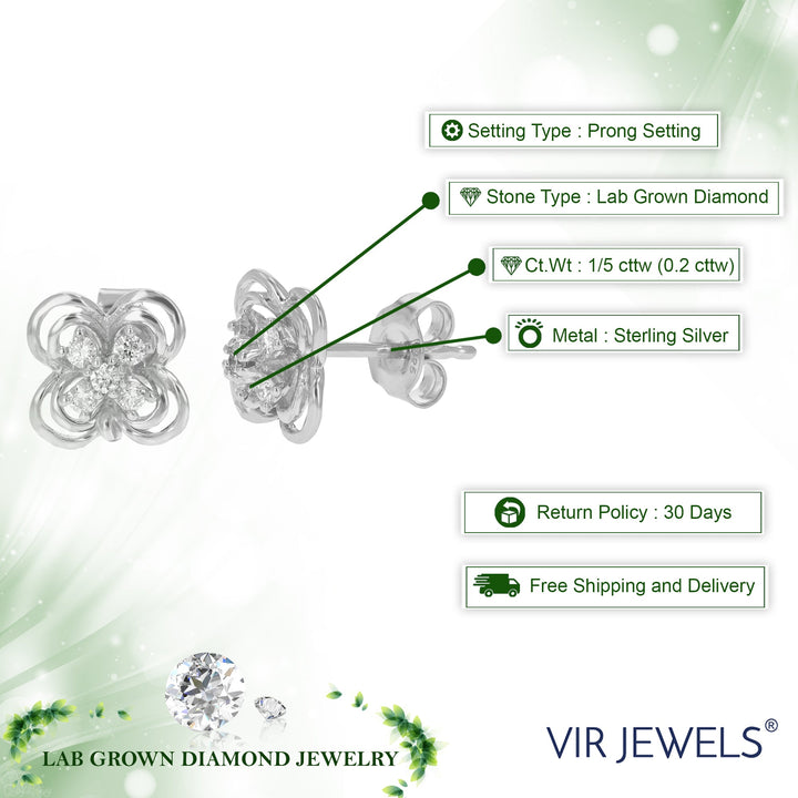 1/5 cttw Round Lab Grown Diamond Stud Earrings .925 Sterling Silver Prong Set Floral Design