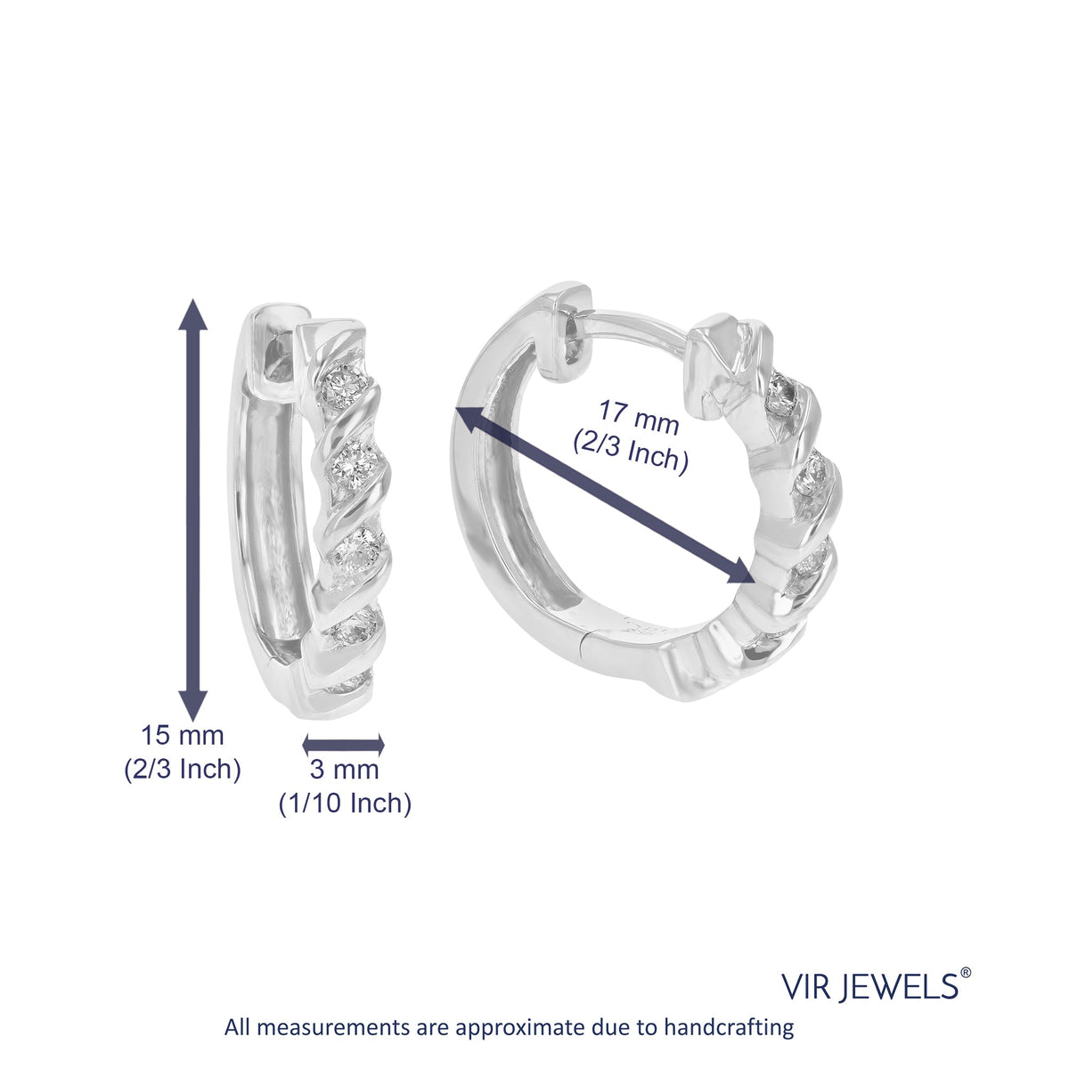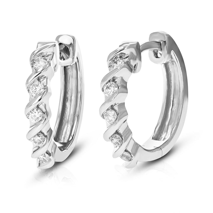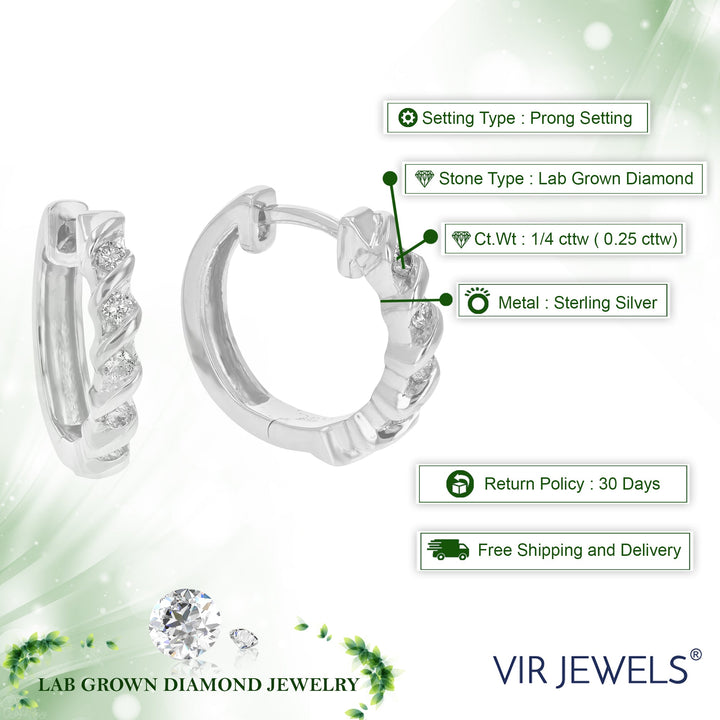 Handcrafted in .925 sterling silver with 10 round lab-grown diamonds (1/4 cttw). Diamond clarity: SI1-SI2, color: H-I. Channel setting. Hoop earrings width: 3 MM (1/10 Inch); Height: 14 MM (1/2 Inch).