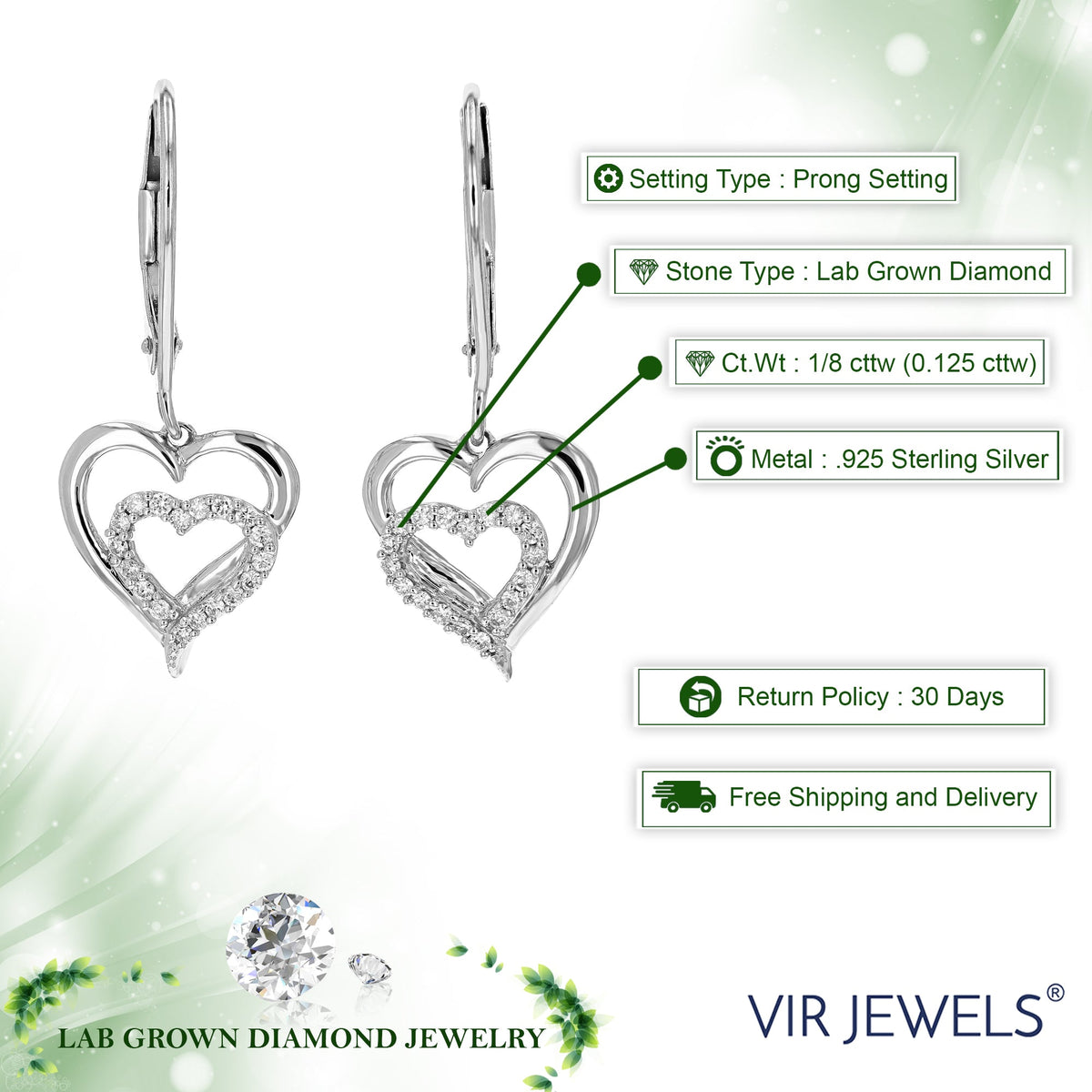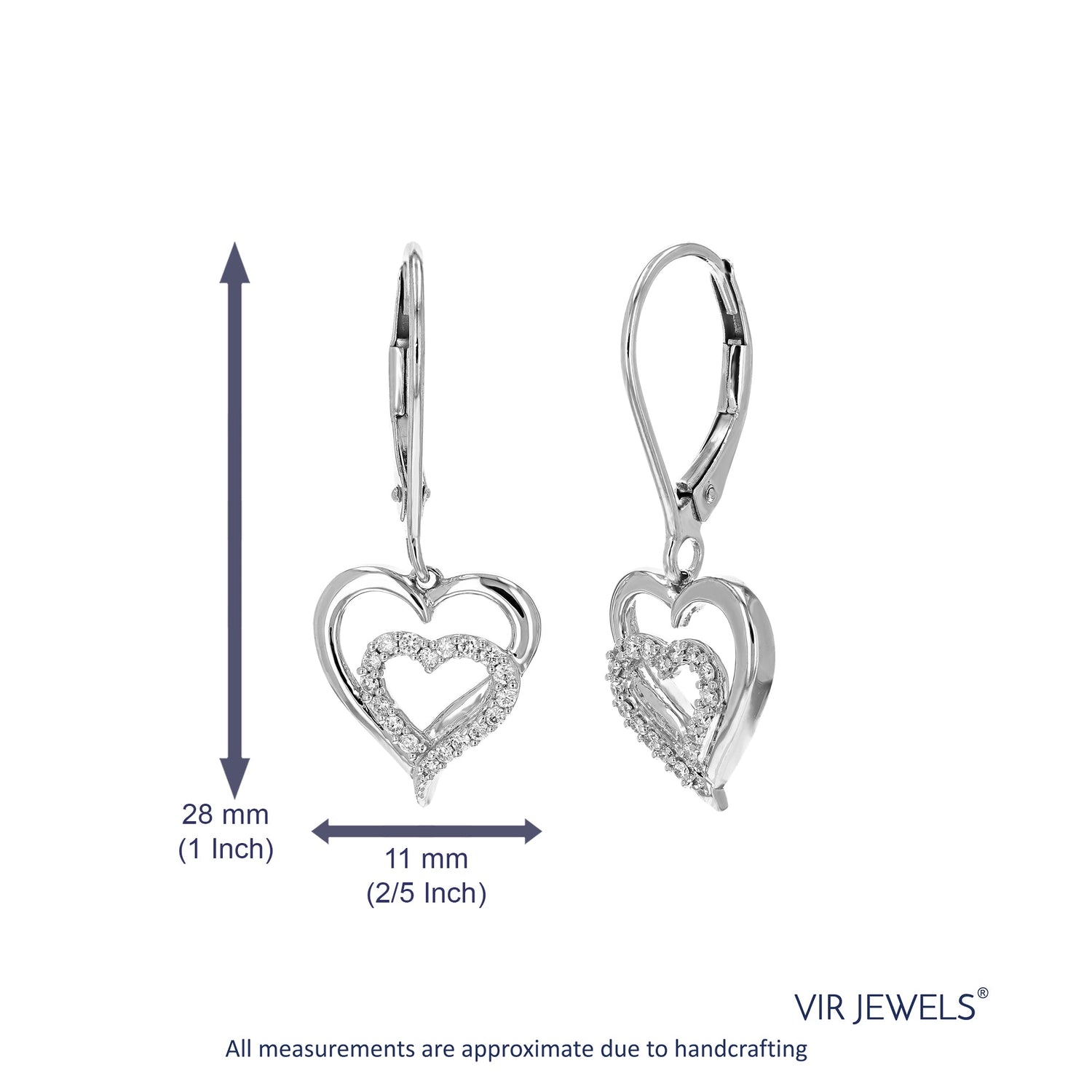 Set in .925 sterling silver with 36 round lab-grown diamonds totaling 1/8 cttw. Diamonds are H-I color, SI1-SI2 clarity. Prong setting for secure placement. Earring dimensions: 11mm (2/5 inch) in width, 25mm (1 inch) in height.