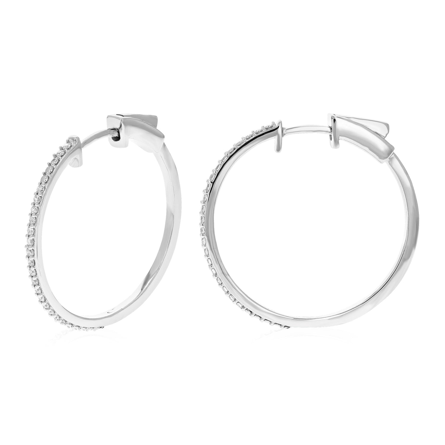 Handcrafted in .925 sterling silver with 32 round-cut lab-grown diamonds, totaling 1/4 cttw. Diamond color H-I, clarity SI1-SI2. Prong setting for secure diamond placement. Hoop width: 1mm (1/20 inch); height: 27mm (1 inch).