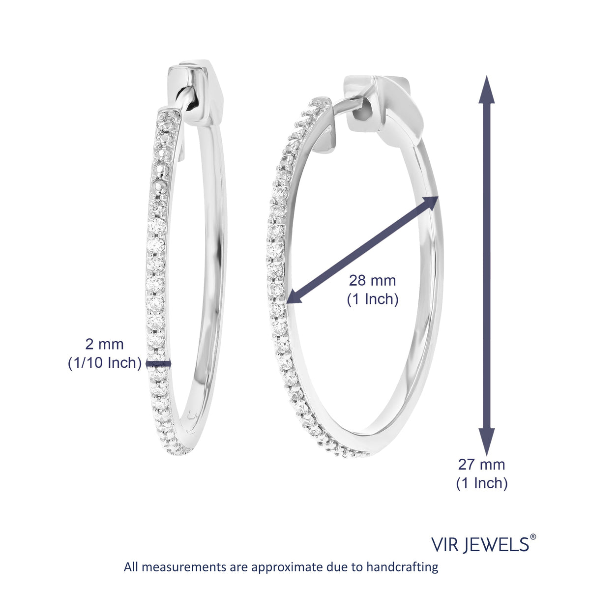 These 1/4 cttw Round Lab Grown Diamond Hoop Earrings by Vir Jewels feature 32 sparkling round-cut diamonds set in .925 sterling silver, offering a classic yet elegant look. The prong setting ensures that each diamond is securely placed and highlights their brilliance. With a 1-inch hoop size, these earrings provide a perfect balance of sophistication and versatility. Ideal for both everyday wear and special occasions, they add a touch of glamour to any outfit.