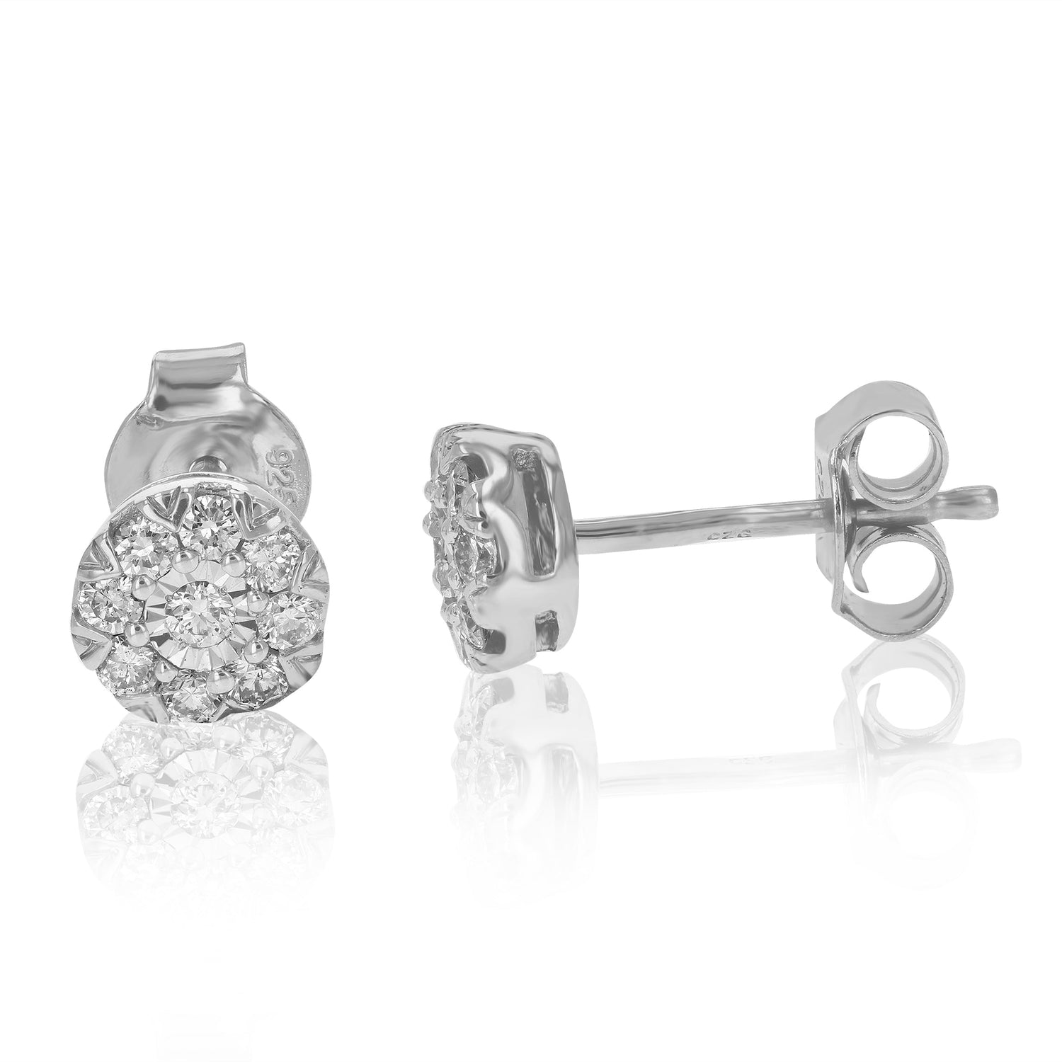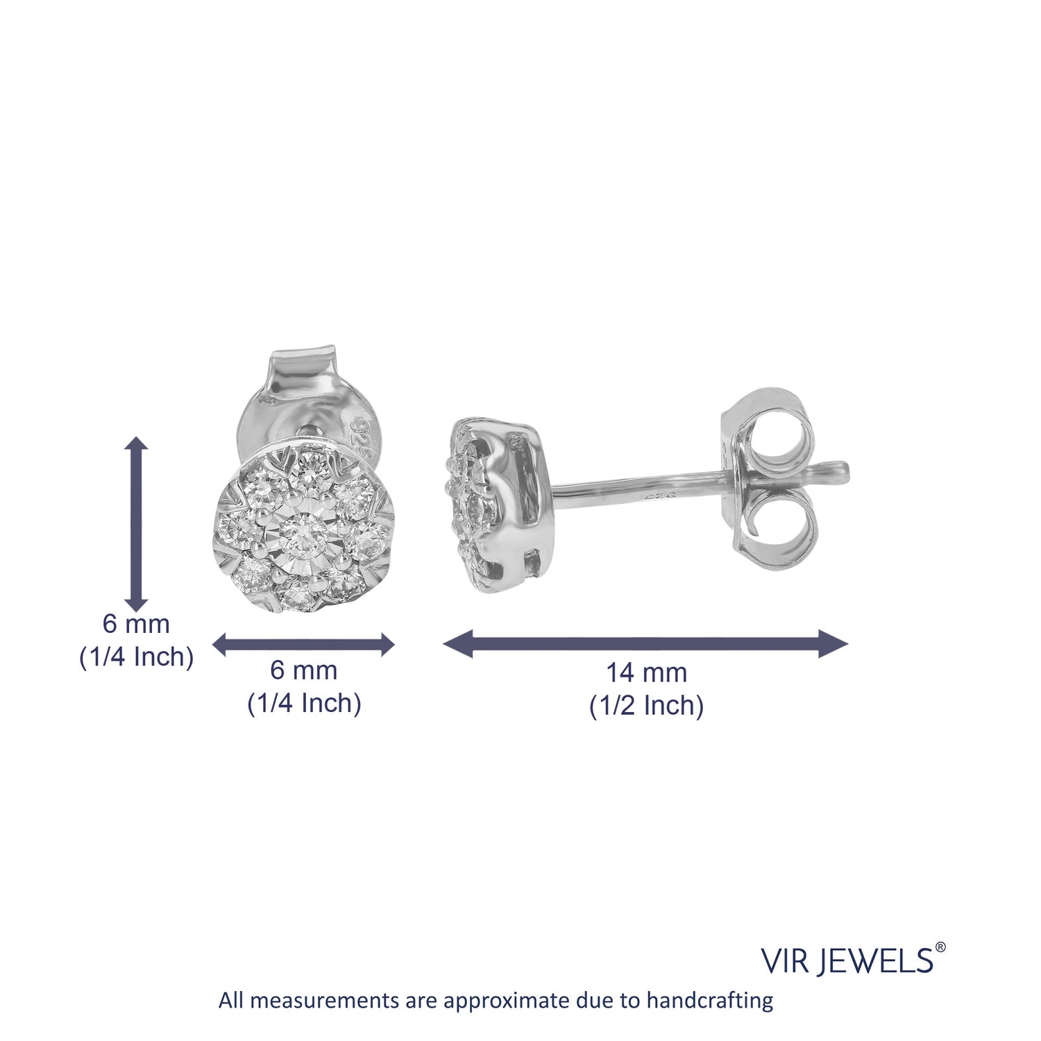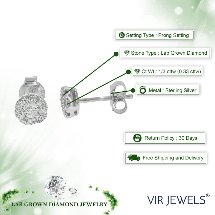 Set in .925 sterling silver with 18 round lab-grown diamonds totaling 1/3 cttw. Diamonds are H-I color, SI1-SI2 clarity. Prong setting for secure placement. Earring dimensions: 6mm (1/4 inch) in width and height.