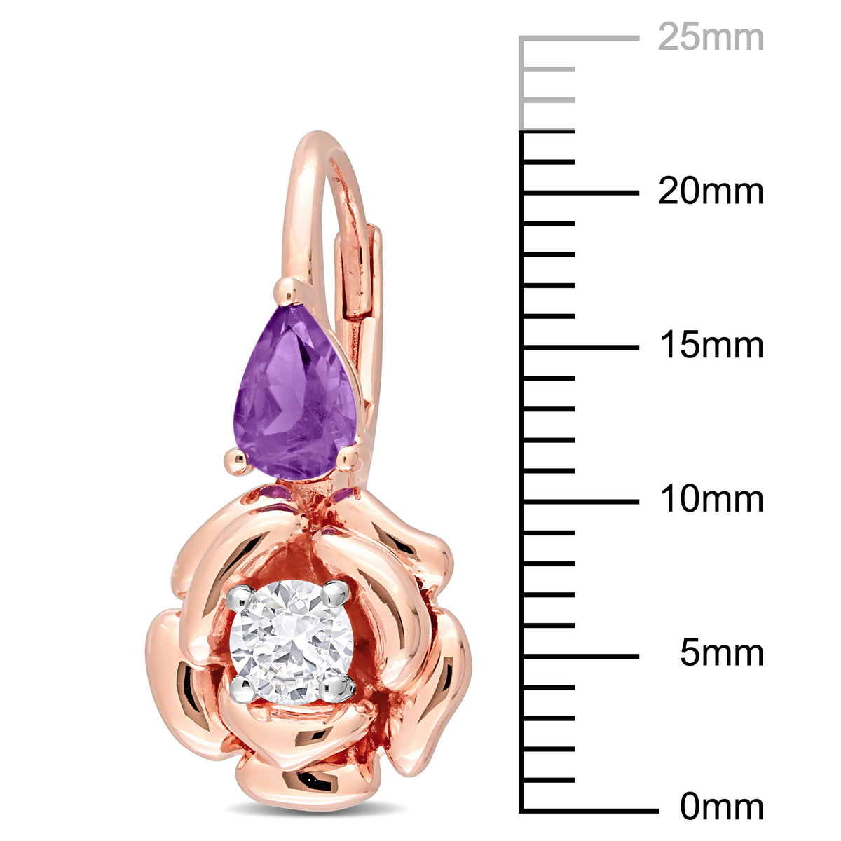 Crafted in rose-plated sterling silver with 1 1/3 CT TGW of pear-cut African amethyst and white topaz gemstones. Leverback clasps.