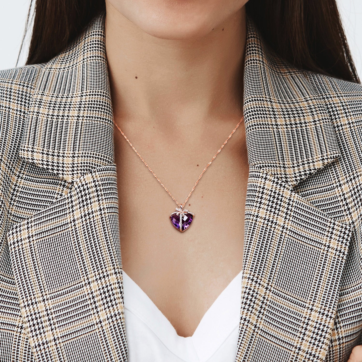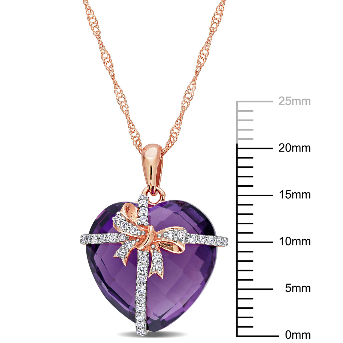 Handcrafted in 10k rose gold with a 12ct TGW amethyst (14mm, heart-shaped) and 33 round-cut diamonds (1/8ct TDW). Diamond color: G-H, clarity: I2-I3. Chain: 17-inch rope chain with spring ring clasp. Pendant dimensions: 15.6mm x 20.7mm.