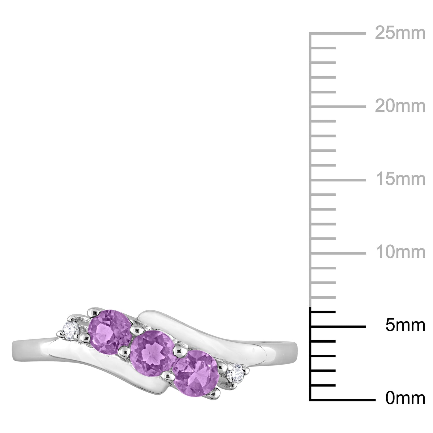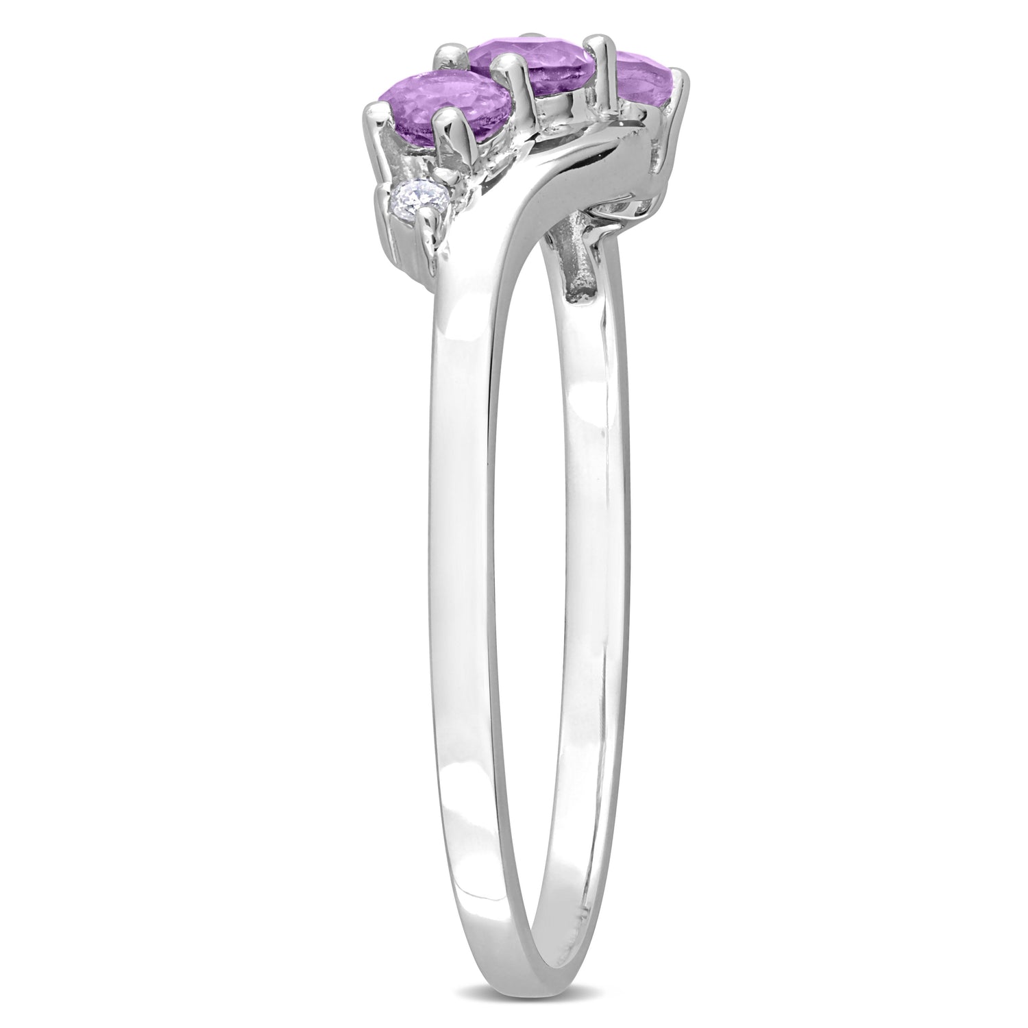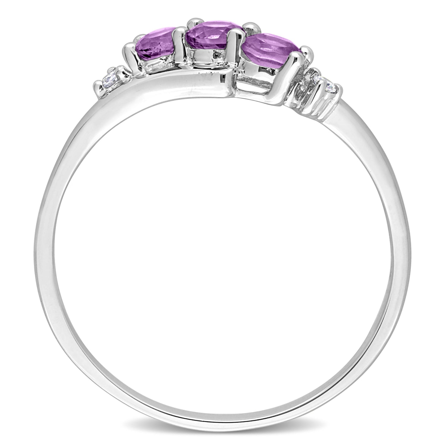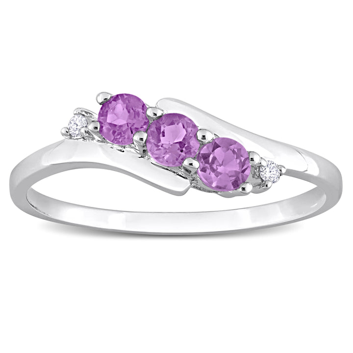 Crafted in 10K white gold, featuring 3 round-cut Amethyst stones and 2 round-cut diamonds.