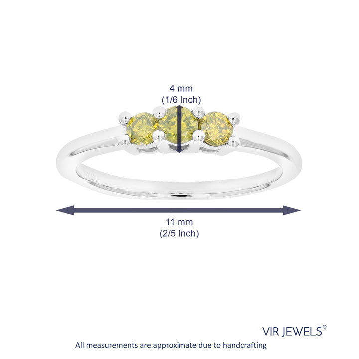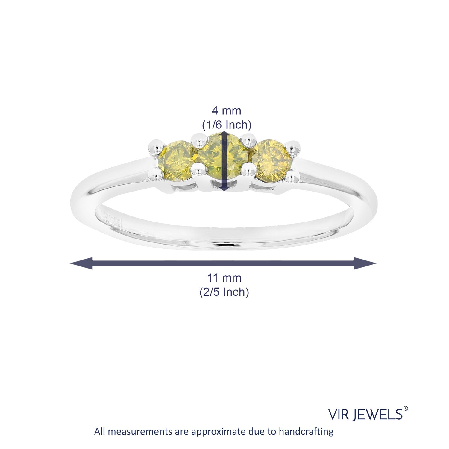 This 3/8 cttw 3 Stone Round Cut Yellow Diamond Engagement Ring by Vir Jewels features three round yellow diamonds set in a prong setting on a gleaming .925 sterling silver band. This classic engagement ring is beautifully designed with a natural yellow diamond as the centerpiece, surrounded by two more diamonds. It’s a perfect piece for someone looking to add timeless sparkle to their proposal.