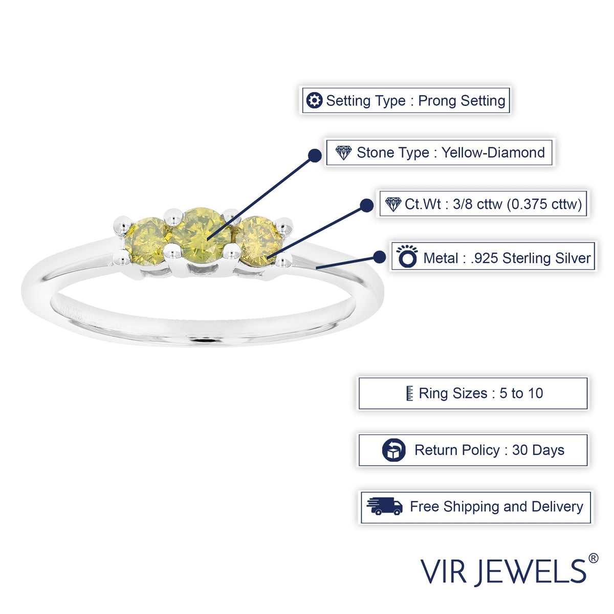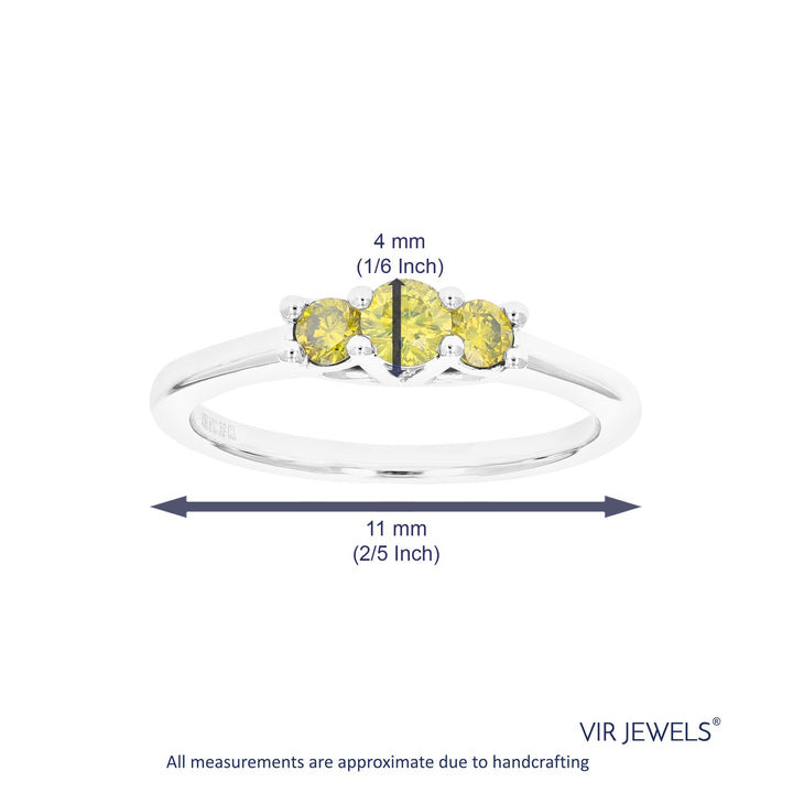 This 1/3 cttw 3 Stone Round Cut Yellow Diamond Engagement Ring in .925 Sterling Silver by Vir Jewels features three radiant yellow diamonds in a prong setting. The diamonds are naturally irradiated, enhancing their rich, vibrant color. The band is crafted from sterling silver and provides a beautiful, timeless setting for these brilliant diamonds. This engagement ring is perfect for those seeking a unique and radiant look for their special day.