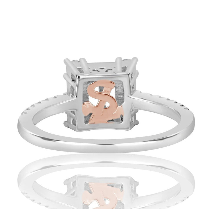 Sterling silver with baguette and round-cut cubic zirconia. Two-tone rose gold plating with a closed under-gallery. Hidden diamond in the shank.