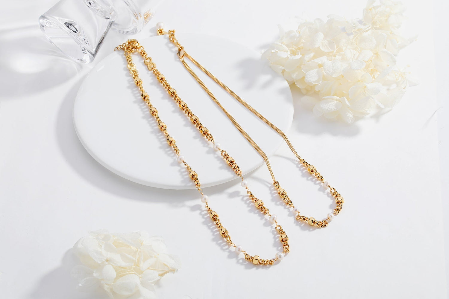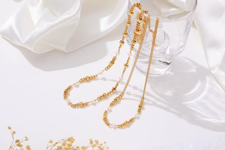 This Popular Double Stranded Necklace With Natural Pearls by Classicharms is a delicate and timeless piece that offers subtle elegance. Featuring natural freshwater pearls and hexagon beads, the two strands of thin 18K gold-plated chains create a refined and layered look. This handcrafted necklace is perfect for everyday wear and can be paired with other mini pearl necklaces from the collection for added sophistication or worn alone as a minimalist statement.