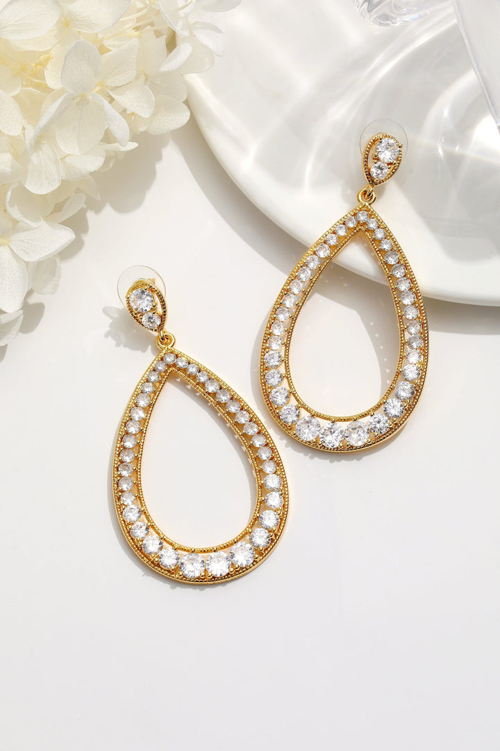 These Artisanal Pavé Hollow Teardrop Earrings by Classicharms are a stunning combination of classic design and modern elegance. Each earring features an open hollow teardrop shape, elegantly lined with sparkling, diamond-like cubic zirconia stones. Perfect for a cocktail event or wedding, these statement earrings exude timeless charm. They are designed to complement a refined, sophisticated style, adding an extra layer of glamour to any evening look.