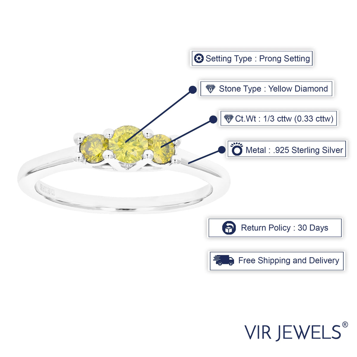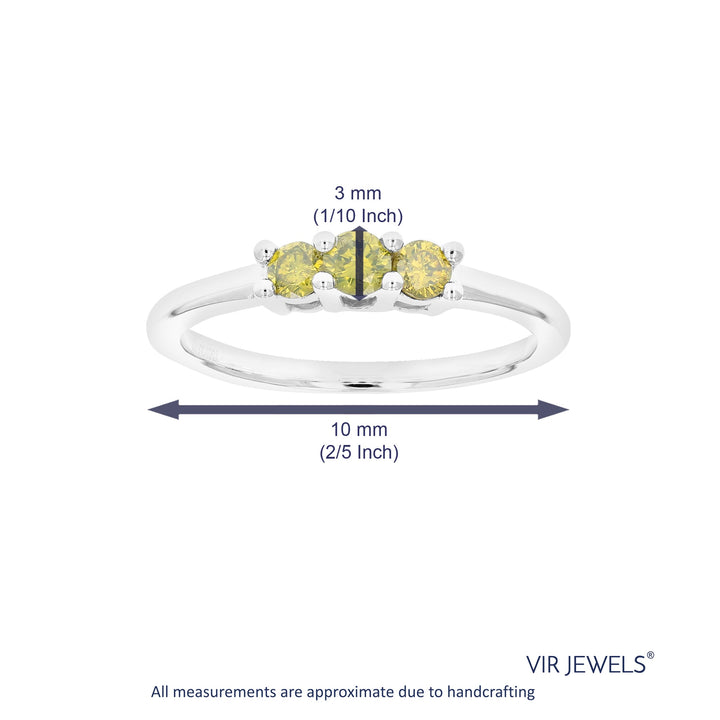 This 1/3 cttw 3-Stone Round Yellow Diamond Engagement Ring by Vir Jewels is a truly unique engagement piece. Featuring three radiant yellow diamonds, the prong setting allows for maximum brilliance, while the sterling silver band provides a contemporary touch. A meaningful choice for a proposal or a special anniversary.