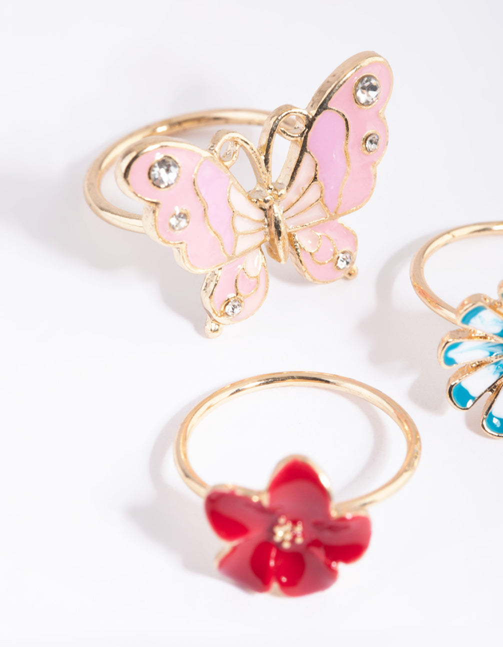 Made from gold-plated metal with butterfly and flower designs. Available in multiple sizes.