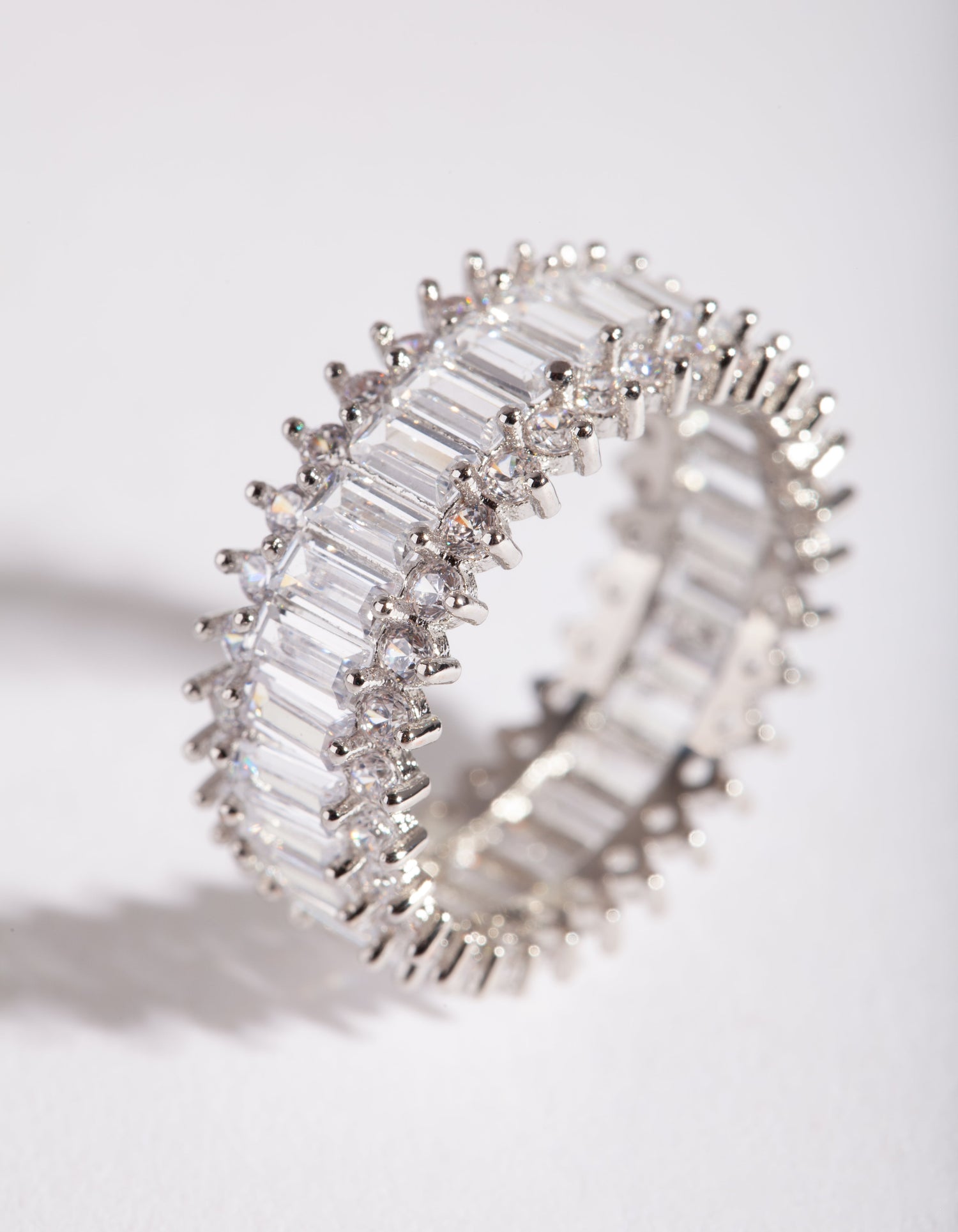 Rhodium-tone setting with baguette-cut cubic zirconia for a dazzling effect.