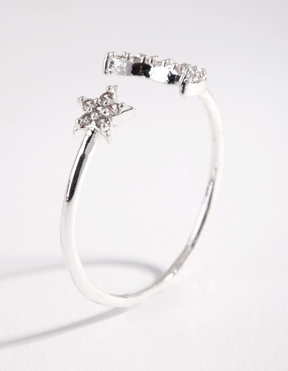 This Silver Cubic Zirconia Moon and Star Ring by Lovisa adds a touch of celestial charm to any look. Featuring a stunning cubic zirconia-embellished moon and star design, this open-ring style is perfect for adding sparkle to your everyday styling. The silver-toned setting enhances the shimmering effect of the stones, making this piece both whimsical and elegant.