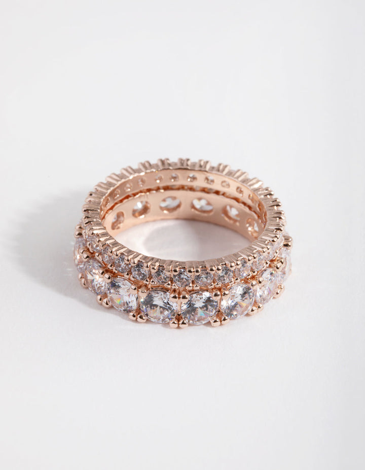 This Rose Gold Double Band Set Ring by Lovisa is a chic and elegant addition to any jewelry collection. The two rose-gold toned bands are encrusted with sparkling cubic zirconia stones that resemble the clarity and brilliance of diamonds. This stylish set can be worn together or separately, making it a versatile piece for any occasion.