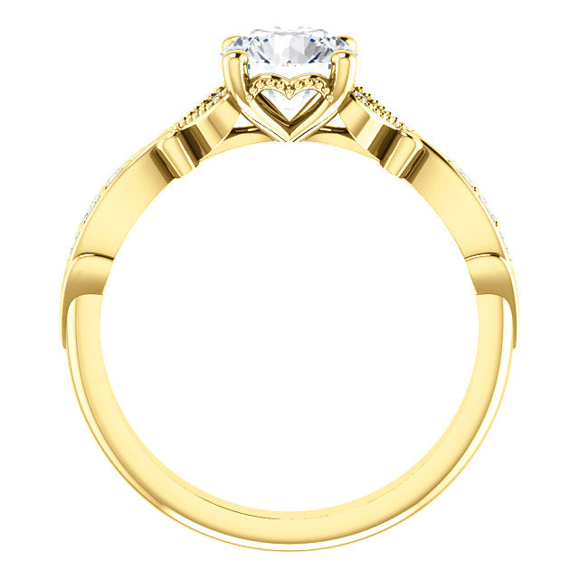 Handcrafted in 14k yellow gold with a 1ct round brilliant cut diamond and additional diamonds. Diamond clarity: SI, color: G-H.