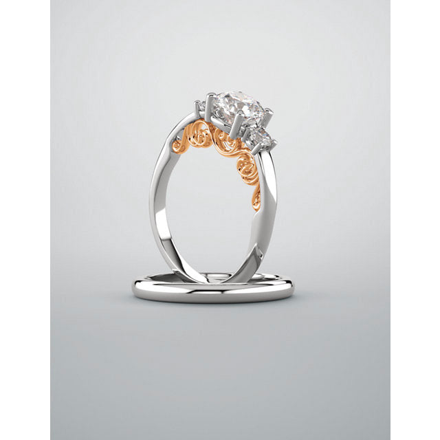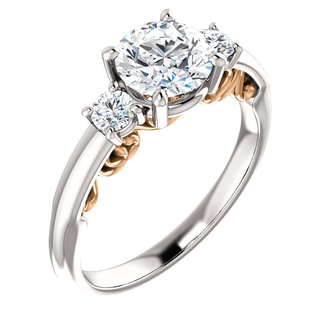Features a 1ct clarity-enhanced center diamond and two accent diamonds, set in solid 14k white and rose gold. Available in multiple sizes.