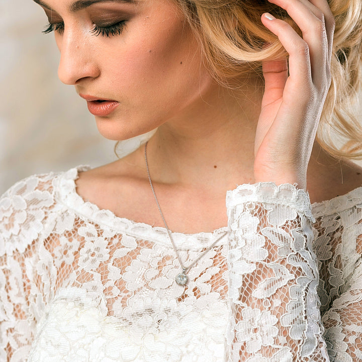Sterling silver. Natural aquamarine, 1 5/8 cttw. Diamond-cut halo design. Pendant dimensions: 10mm x 17.3mm. Chain: Cable, included. Length: 18 inches. Clasp: Spring ring. Metal weight: 1.4 grams.
