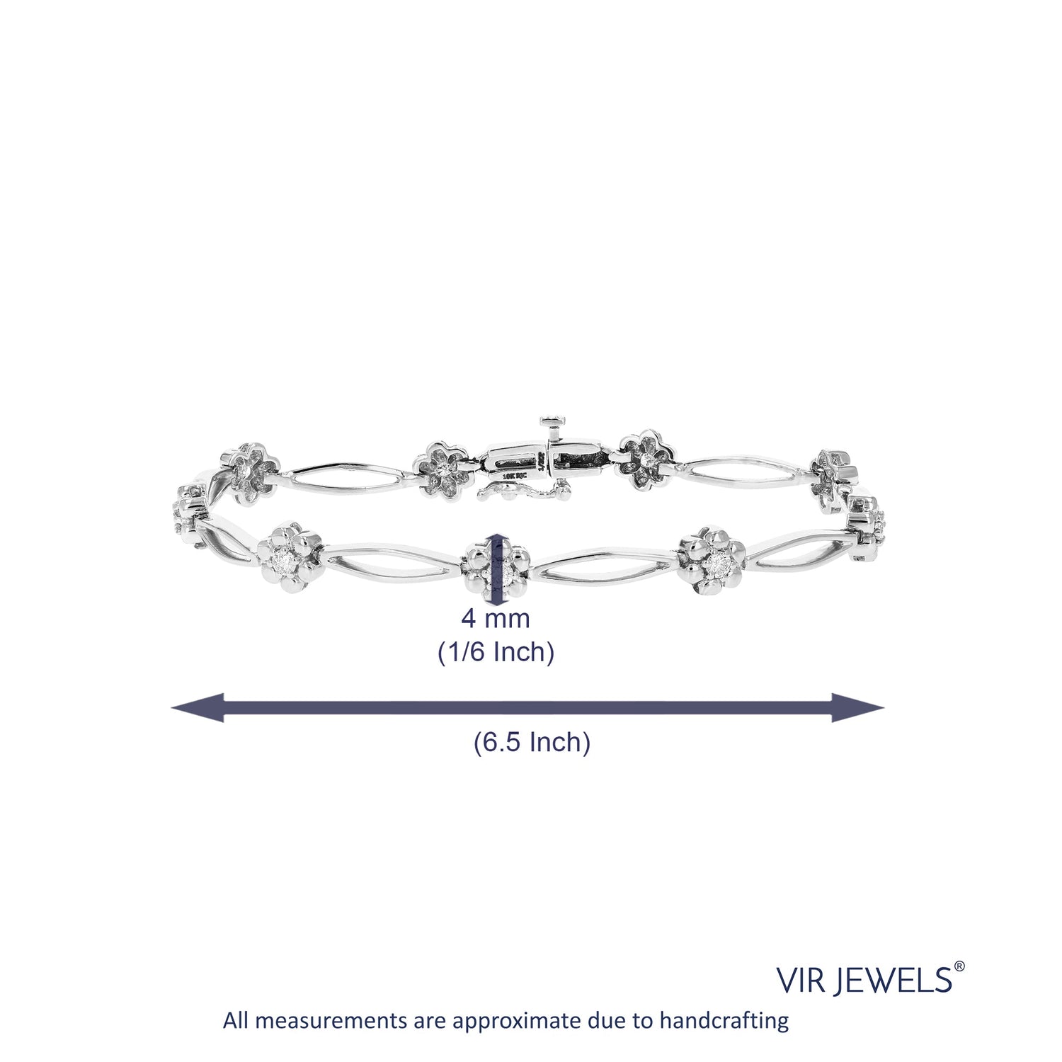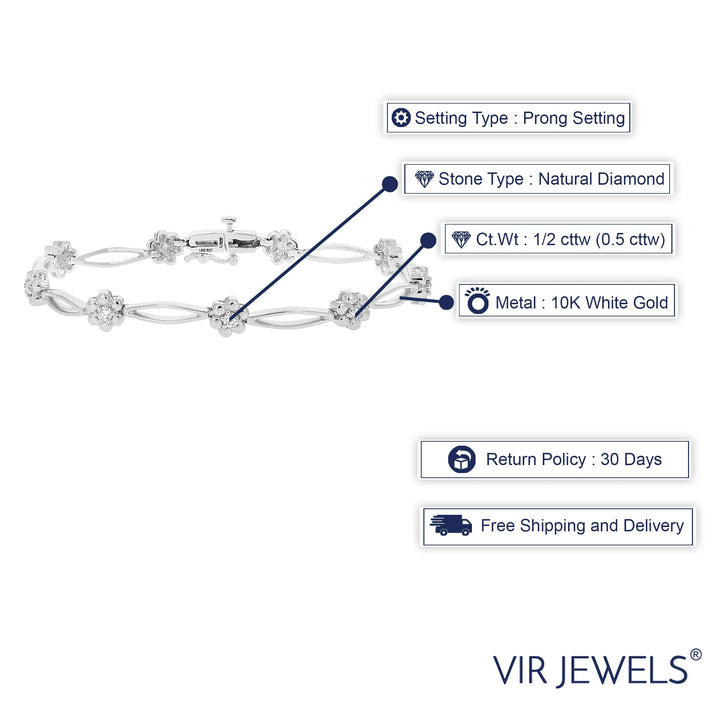 This 1/2 cttw SI2-I1 Diamond Bracelet in 10K White Gold by Vir Jewels features a unique flower and clover shape design. The nine sparkling round diamonds are set in prong settings, offering a beautiful display of light. The bracelet is secured with a box and tongue safety clasp, ensuring both style and security.