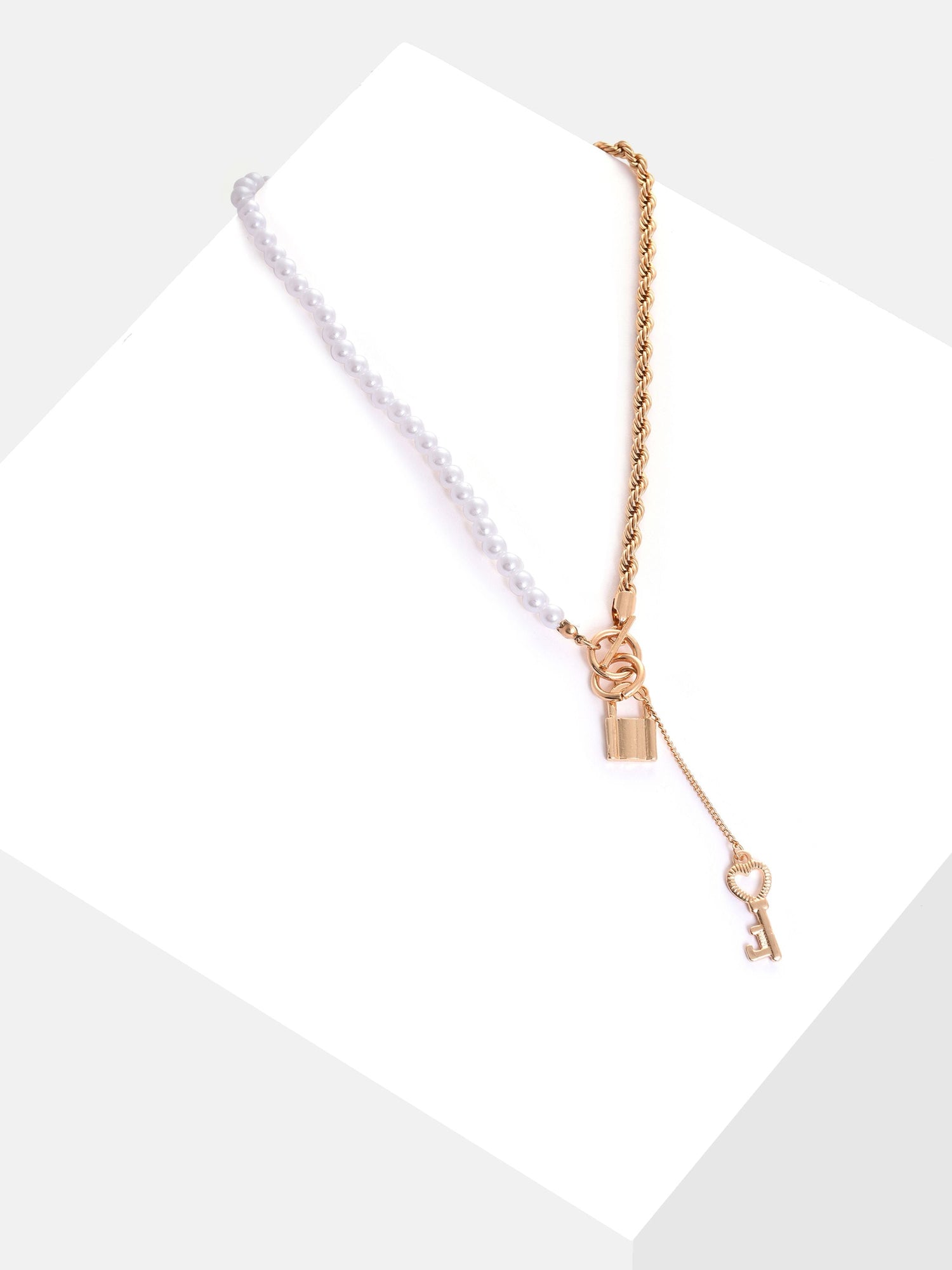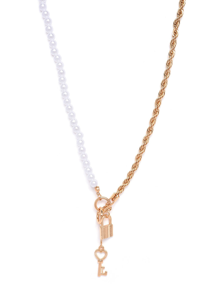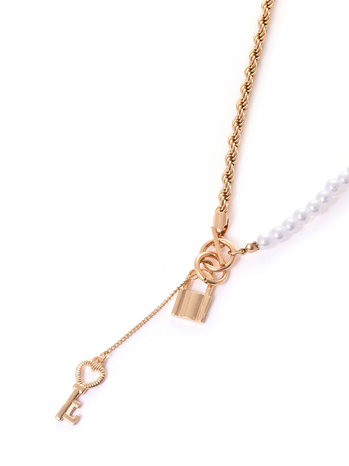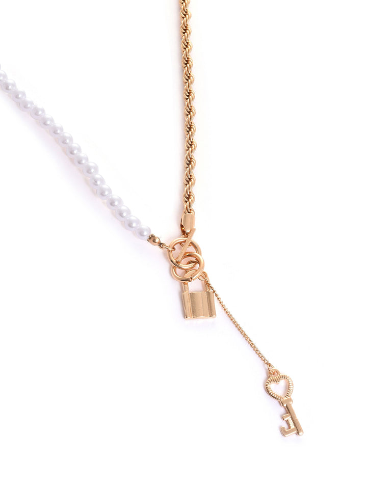 Crafted in gold-plated metal. Additional details and chain length not specified.