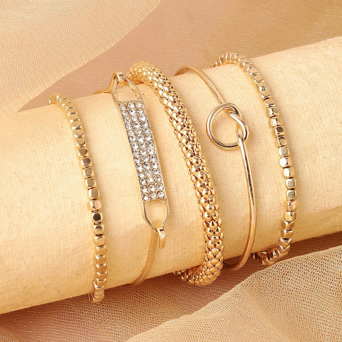 Gold-plated alloy with unique designer stones, measuring standard bracelet size.