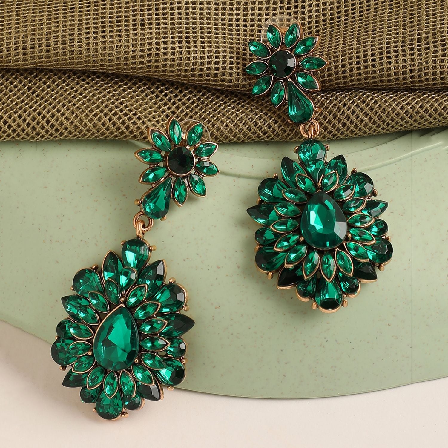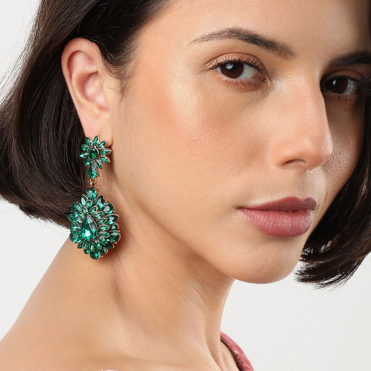 Made from high-quality alloy with a smooth finish, these earrings feature green stones set in a drop design. Lightweight, durable, and anti-allergic.