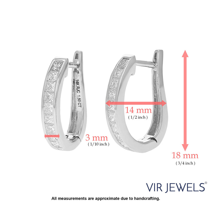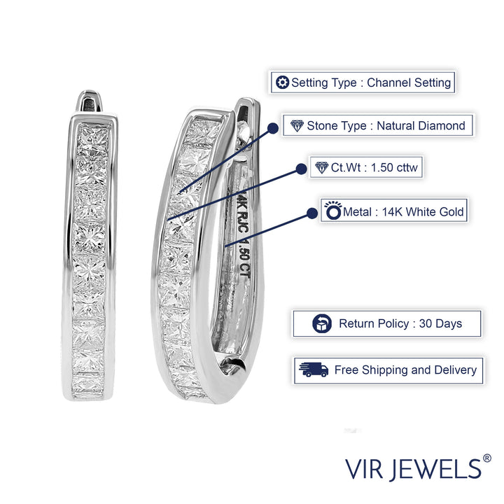 These 1.50 cttw Princess Diamond Hoop Earrings by Vir Jewels are the epitome of classic luxury. Featuring 20 dazzling princess-cut diamonds set in a channel setting, these 14k white gold hoops exude refined elegance. Their secure hinge closure makes them perfect for daily wear or special occasions.