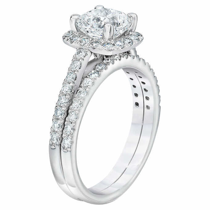 This 2.25 cttw Cushion Halo Diamond Engagement Wedding Ring Set 14k White Gold by Pompeii3 combines classic elegance with modern sophistication. The set features a 1 1/2ct cushion-modified brilliant-cut diamond at the center, flanked by round-cut natural diamonds. The matching wedding band perfectly complements the engagement ring, both set in solid 14k white gold.