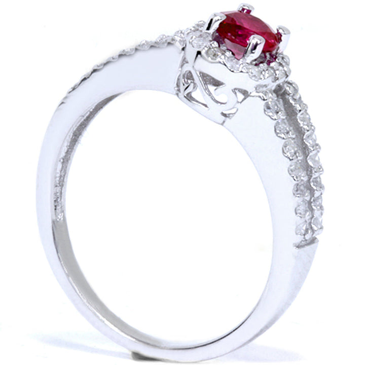3/4ct Ruby & Diamond Split Shank Ring in 14K White Gold by Pompeii3 is a striking piece that combines vibrant color and brilliant sparkle. Featuring a 1/2ct round genuine ruby at the center, accented by round natural diamonds, this ring is set in solid 14k white gold, offering a timeless and elegant design that's perfect for engagements or special occasions.