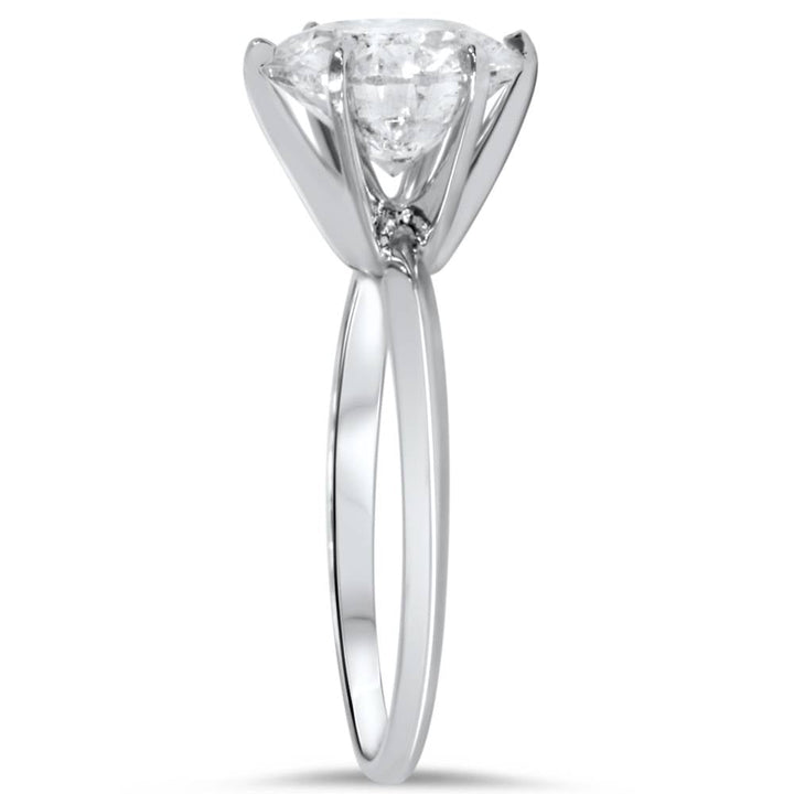 This 2 1/15ct Round Diamond Solitaire Engagement Ring by Pompeii3 features a stunning round brilliant-cut diamond, set in solid 14K white gold. The clarity-enhanced diamond offers a brilliant sparkle, making it a perfect choice for an engagement ring. The timeless solitaire design allows the center stone to take center stage, while the solid white gold band provides a classic and elegant setting. This ring symbolizes everlasting love and commitment, making it the ideal choice for your proposal.