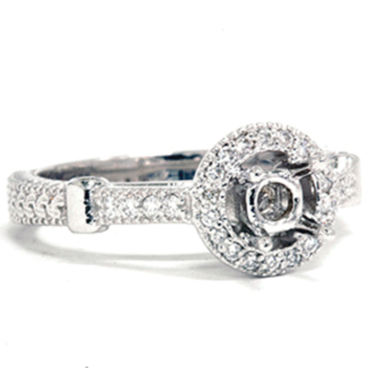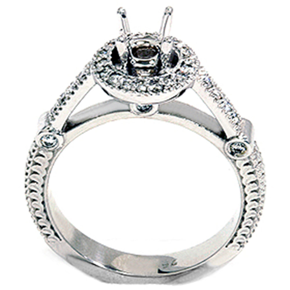 14K white gold with 32 round brilliant-cut natural diamonds. Mount ready to hold a 1/4-5/8ct round diamond.
