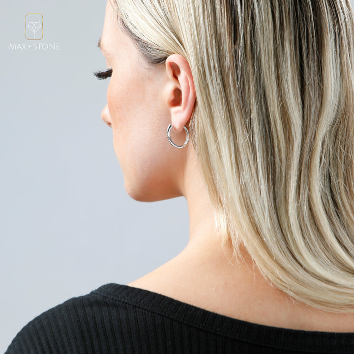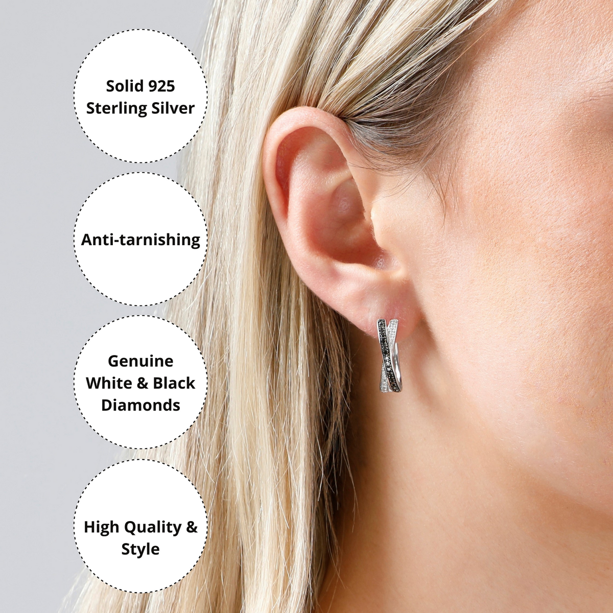 These Sterling Silver Black and White Diamond 'X' Hoop Earrings by MaxColor blend contemporary design with classic sparkle. The striking contrast of black and white diamonds arranged in a bold 'X' pattern makes these hoops a standout accessory. Symbolizing harmony and unity, this design is perfect for those who love meaningful jewelry with a modern edge. Ideal for adding intrigue to both casual and formal attire.