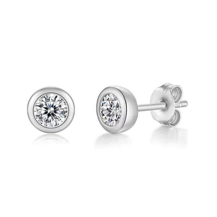 Made from sterling silver, featuring 1ctw round lab-created moissanites (VVS1 clarity, D color). Bezel set, with butterfly backs.