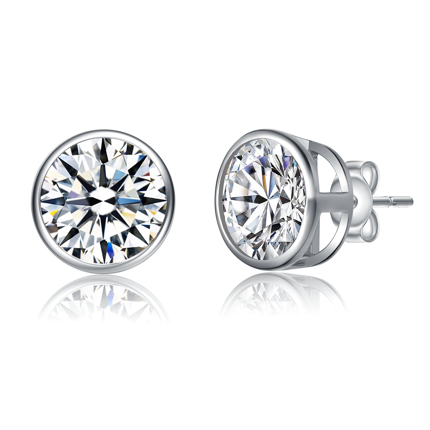 Sterling silver with 14k yellow gold or white gold plating. 2.40ctw round brilliant-cut lab-created moissanites (VVS1 clarity, D color). Bezel setting. Butterfly backs for secure closure.