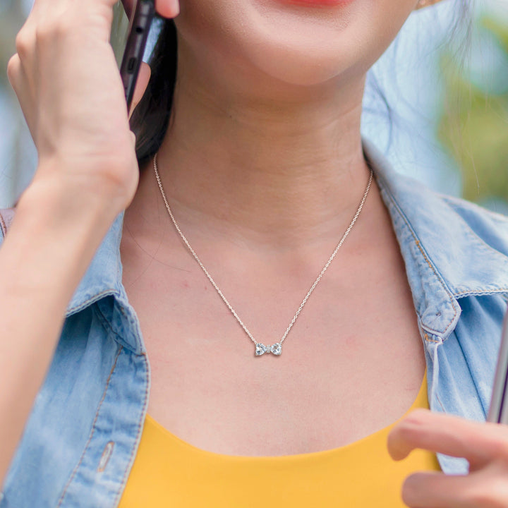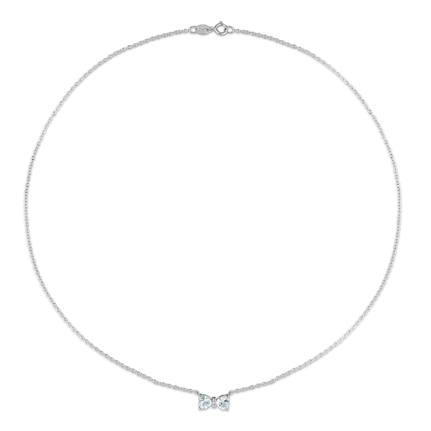 The Mimi & Max 3/4 CT TGW Heart Aquamarine and Diamond Accent Bow Necklace in Sterling Silver combines elegance with a playful design. The necklace features two heart-cut aquamarine gemstones, channel-set, with bezel-set diamonds creating a charming bow design. The lustrous sterling silver and iridescent gemstones make this necklace a must-have for any occasion. Perfect for adding a soft pop of color to your outfit, this necklace is an enchanting addition to your jewelry collection.