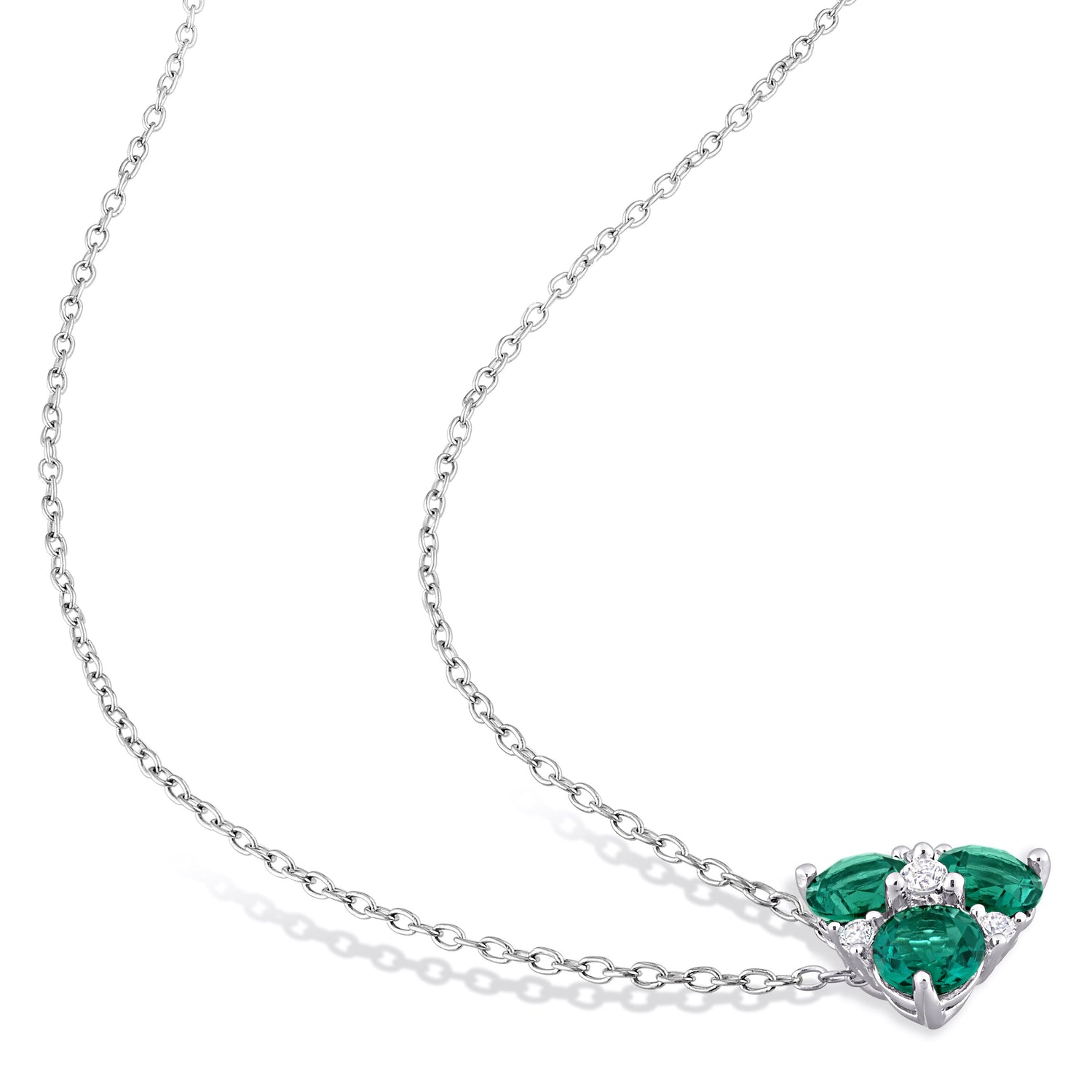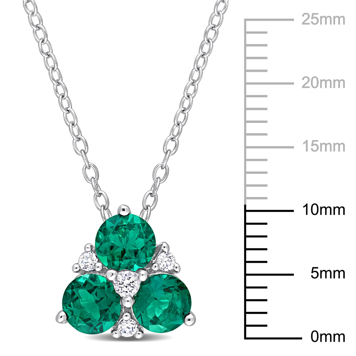 This Mimi & Max 1 1/4 CT TGW Created Emerald and Created White Sapphire 3-Stone Pendant with Chain in Sterling Silver is an eye-catching piece perfect for adding a touch of glamour to any ensemble. The three round-cut created emeralds and four created white sapphires are set in a modern triangle design. Suspended from an 18-inch round cable chain, this pendant has a high-polish finish, making it a versatile addition to your jewelry collection.
