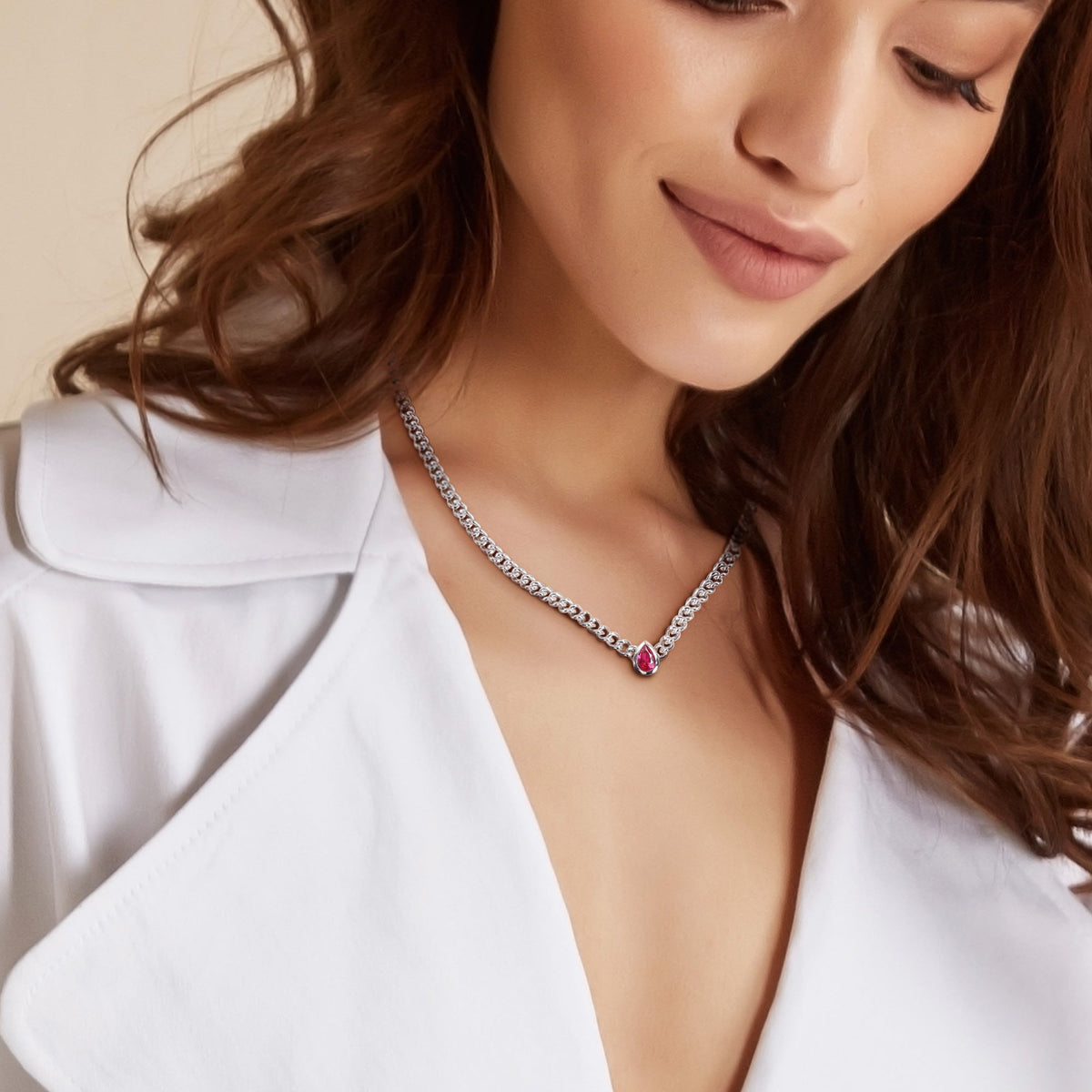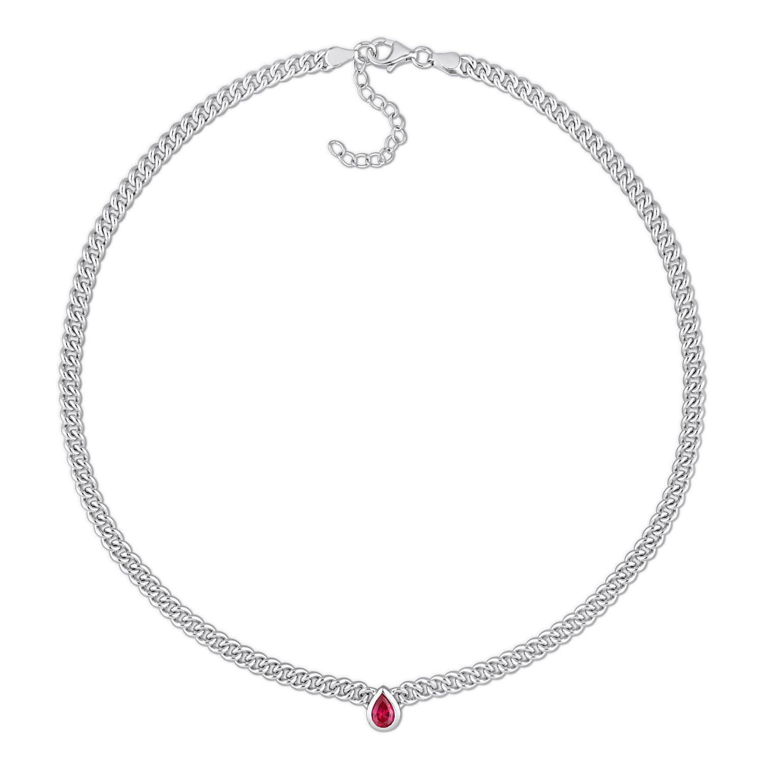 Crafted in sterling silver, featuring a 7x5mm pear-cut created ruby gemstone. Necklace length: 16 inches with lobster clasp closure.