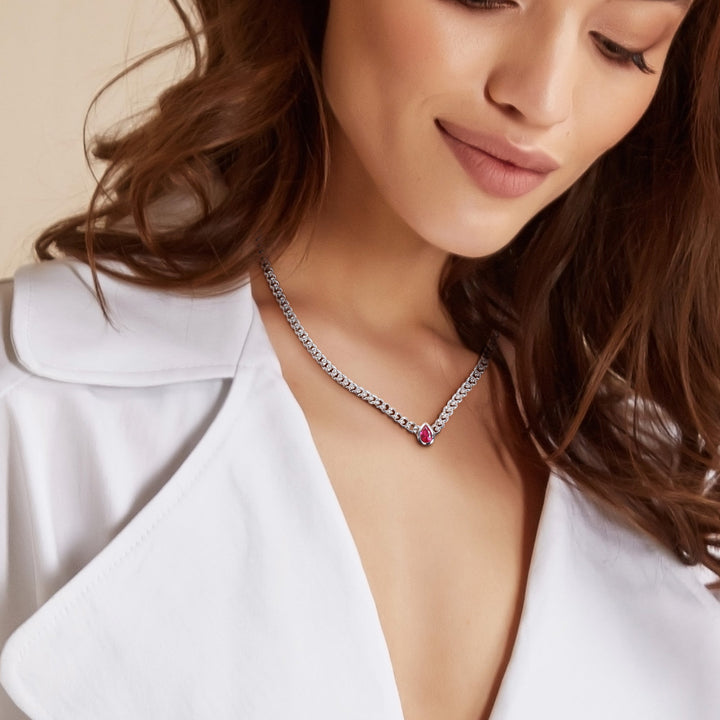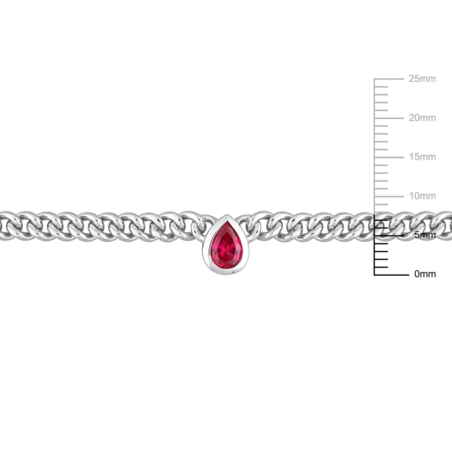 This Mimi & Max 1 1/7 CT TGW Pear Created Ruby Curb Link Chain Necklace in Sterling Silver adds a touch of sophistication to your jewelry collection. The bezel-set pear-cut created ruby gemstone at the center draws attention with its vibrant color. Crafted in lustrous sterling silver, this necklace is perfect for everyday wear or as a statement piece for a special occasion.
