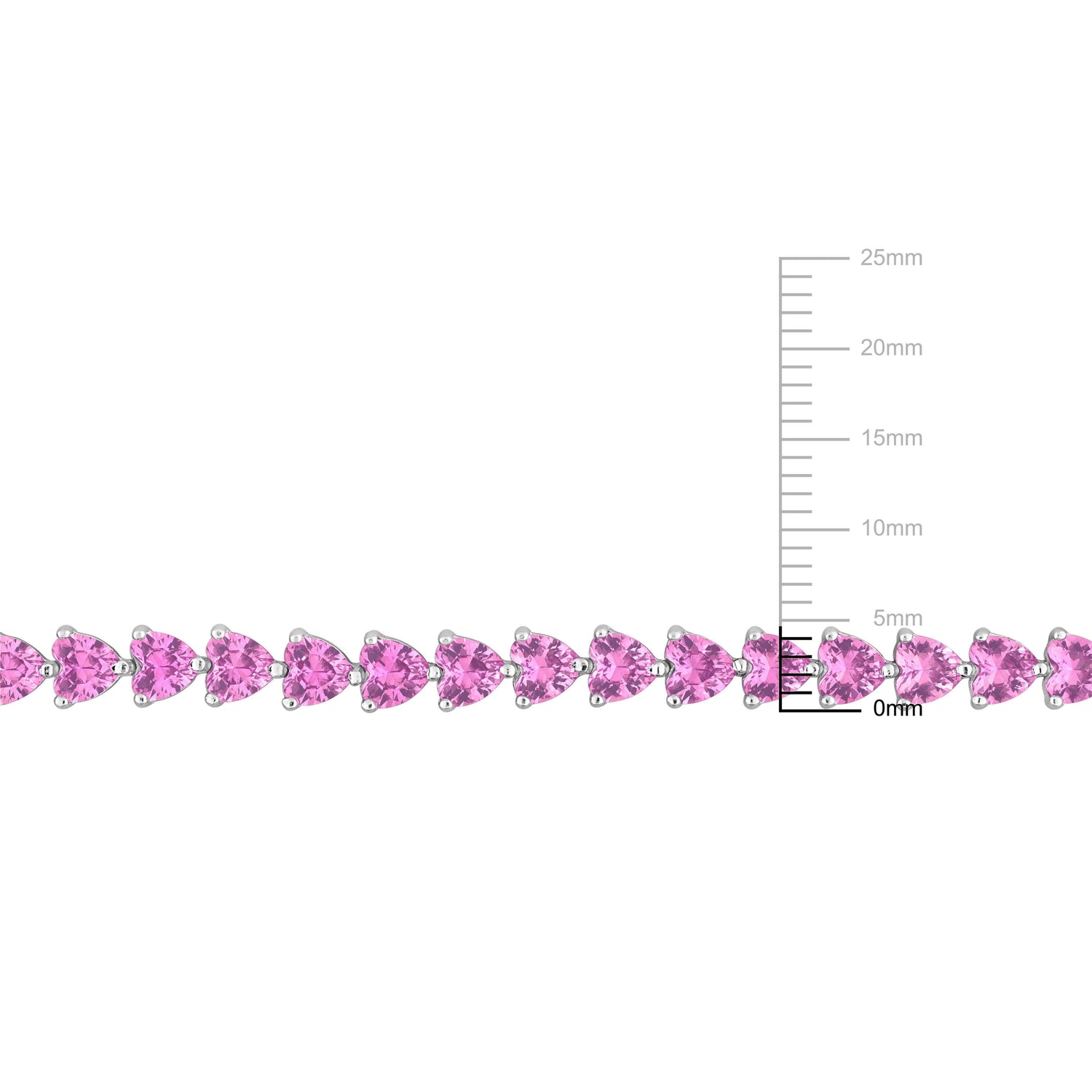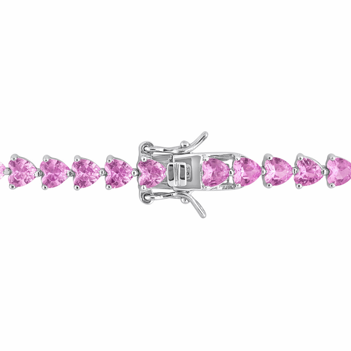 Crafted in sterling silver, featuring 41 heart-cut created pink sapphires totaling 12 1/3 ct TGW. Bracelet length is 7.5 inches, secured with a tongue and groove clasp.