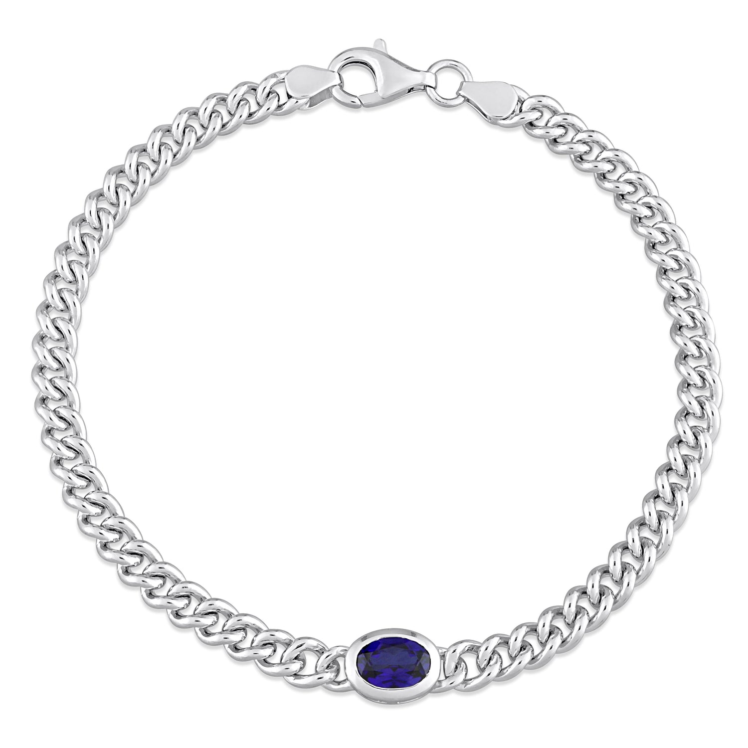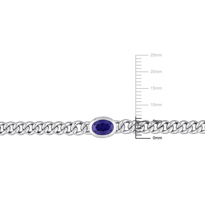 Crafted in sterling silver with 1 1/4ct total gemstone weight. Features a 7x5mm oval-cut created blue sapphire and a 7.5-inch curb link chain with a lobster clasp closure.