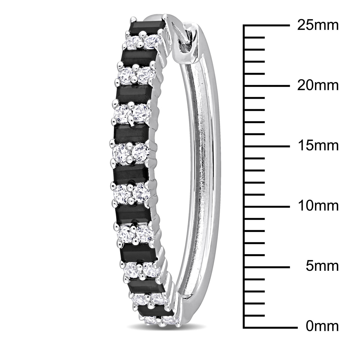 These Mimi & Max 2 1/2 CT TGW Black Spinel and Created White Sapphire Hoop Earrings are a stunning way to add sparkle and elegance to your look. Featuring 18 baguette-cut black spinel gemstones and round-cut created white sapphires, these earrings create a bold contrast and shine. Perfect for parties or social gatherings, these hoop earrings will make you the center of attention wherever you go.